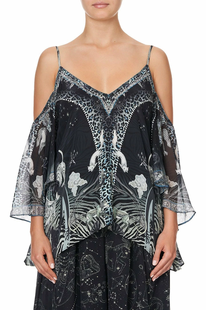 A other-worldly statement top, the Astro Disco Drop Shoulder Strappy Blouse is rich with infinite astrological wonders. This printed silk top is crafted with a print inspired by a delve into the mystical world of astrology and features full length billowing sleeves, a high low hem and feminine exposed drop shoulder neckline that’s embellished with CAMILLA crystals. A piece for lovers of galactic studies, pair over Moon Set Wide Leg Pant with Gathered Pockets.