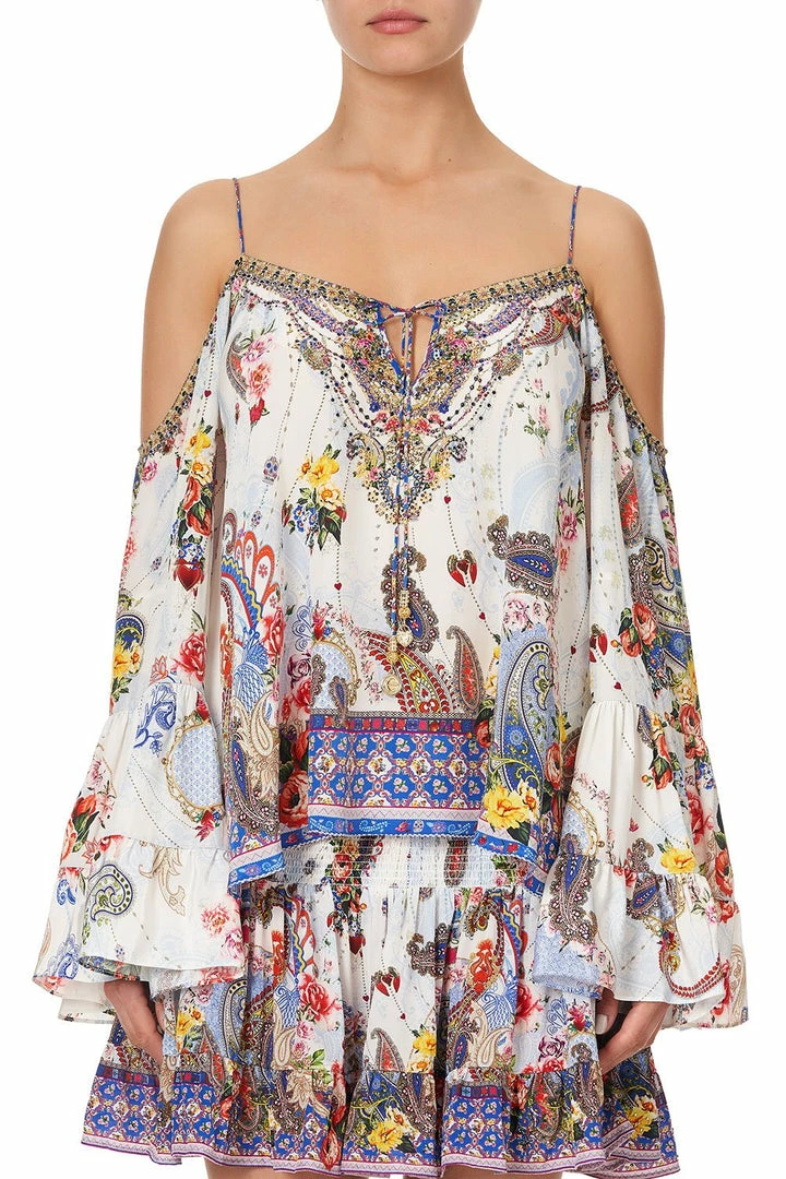 A feminine and bold CAMILLA favourite reimagined with a new season print, the Frida Freedom Drop Shoulder Top is the epitome of boho chic. Cut in a soft printed silk that depicts a kaleidoscope of artful colour and Mexican motifs. Mused by Frida and her unbound love for Mexico, this peasant style top features long ruffle sleeves that dance with movement, darling neck ties, simple shoestring straps and is finished with a glittering array of CAMILLA hand applied crystals. Wear over matching Frida Freedom Short Shirred Skirt for a head to toe look.