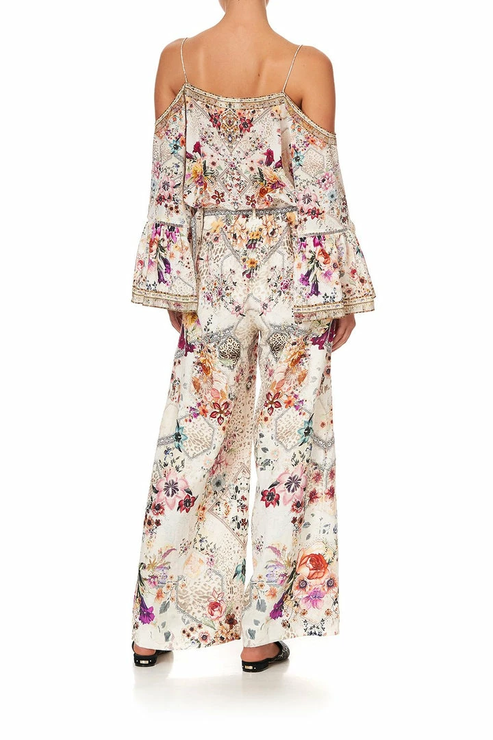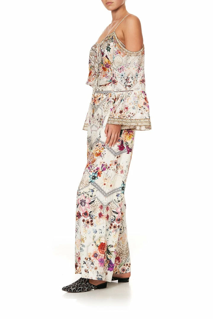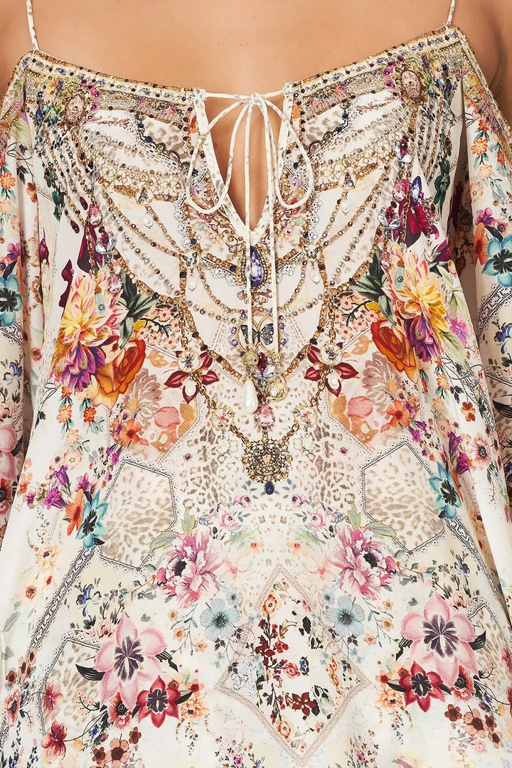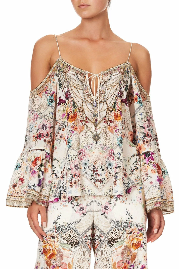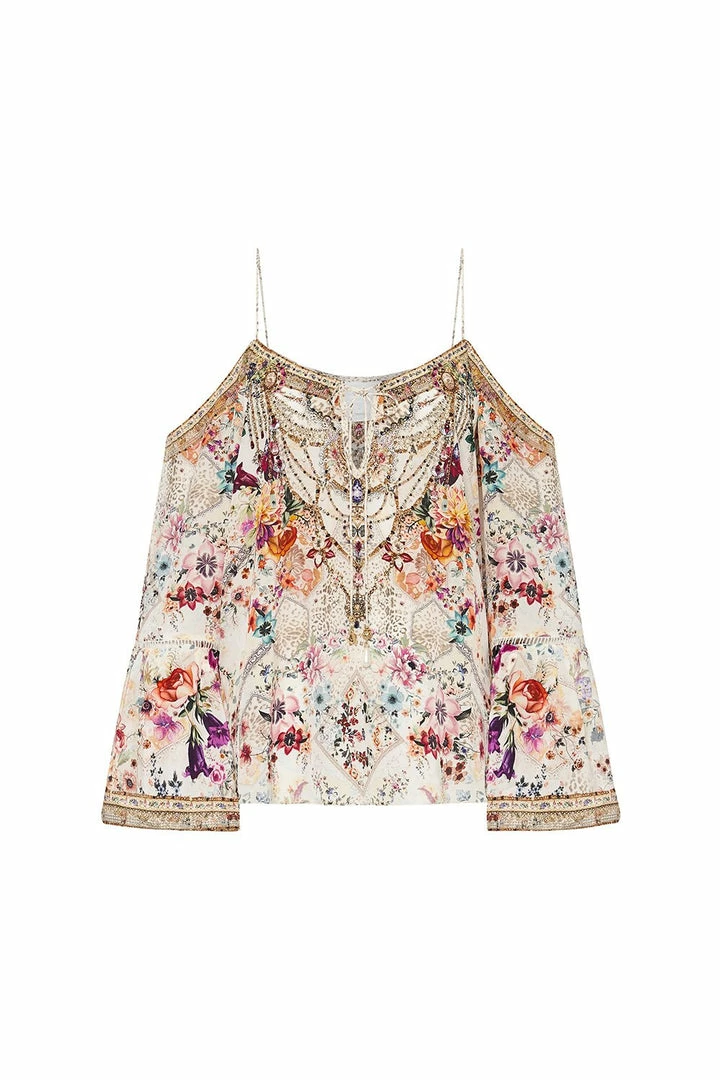 Pretty florals sit against delicate white on the Sew In Love Drop Shoulder Top. Inspired by English gardens and antique markets, this delicate print brings a heritage feel to a modern top. Showing some shoulder with shoestring straps, while sleeve ruffles and CAMILLA crystal embellishment add some glamour.