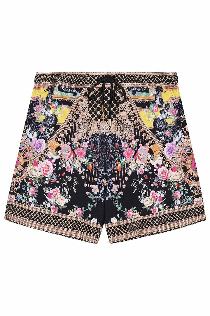 Designed in an opulent resort aesthetic, the Montagues Capulet Elastic Waist Boardshort is rich in renaissance symbolism. Sun safe black Italian stretch nylon is decorated with vibrant florals and enchanting lockets telling the tale of an enduring love story. This luxe resort wear piece is cut in relaxed fit with elastic drawstring waist, side pockets and a further Velcro fastened back pocket. A bold swim short for the print-loving gentleman, pair back with classic white tee for a fun beach look.