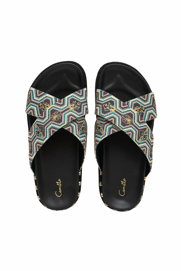 Featuring adorable printed canvas straps, gold studded heel, leather footbed for added comfort and crystal embellishments adorning the honeycomb printed upper.