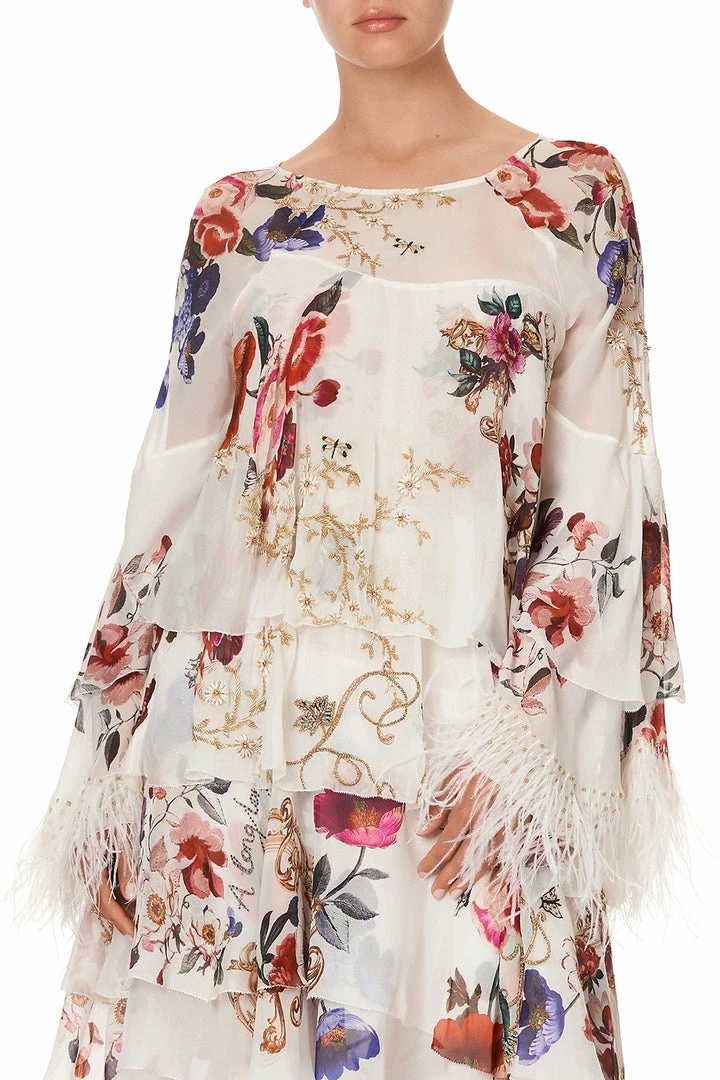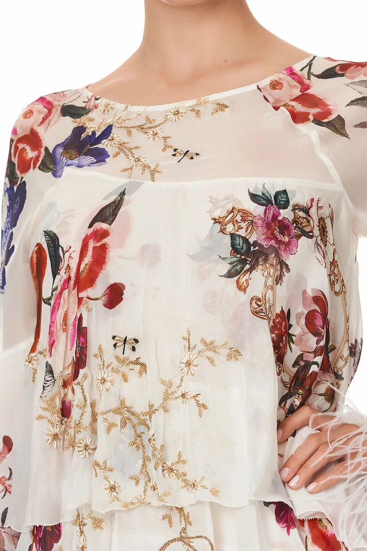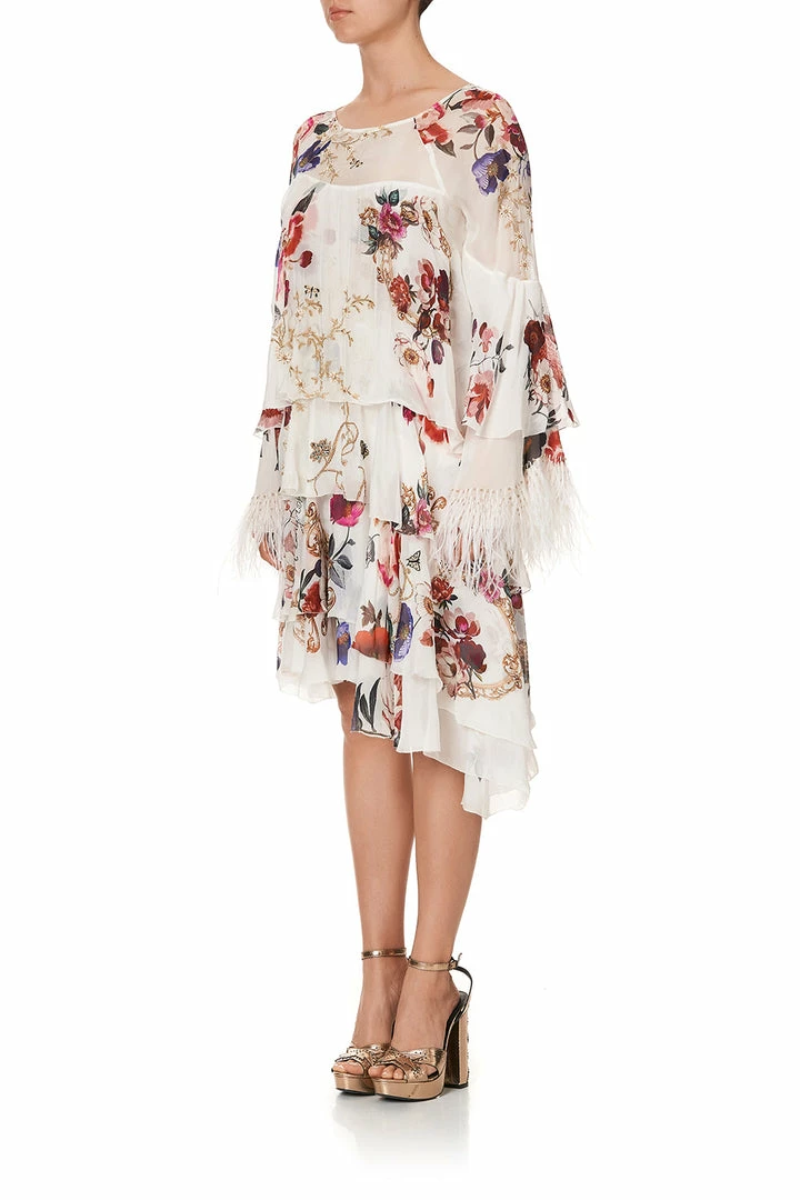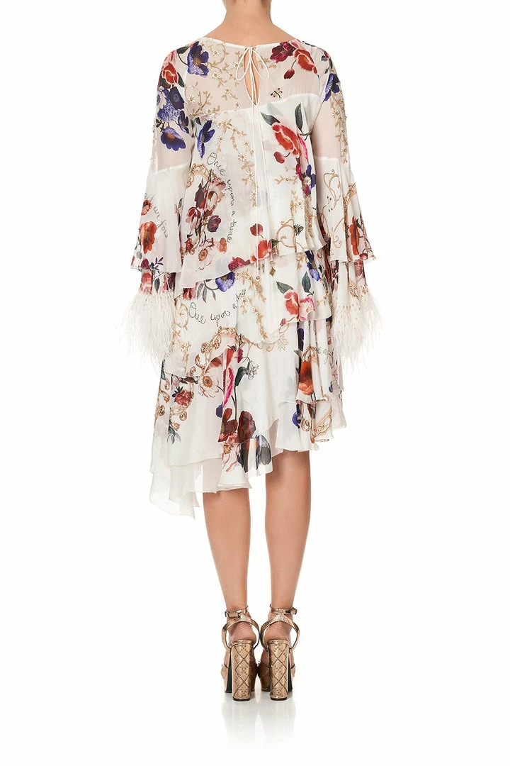 A billowing midi dress for dreamers of magic and wonder, the Fairy Godmother Embellished Flared Layered Dress is heavenly luxe. Crafted with a bespoke CAMILLA print inspired by a bouquet of hand-painted florals blooming against a fanciful cream back drop, this whimsical dress features a flirty flared hem and sleeve, tiered ruffle body, adjustable ties for comfort, ostrich feather trim on sleeves and hand embroidery.Â