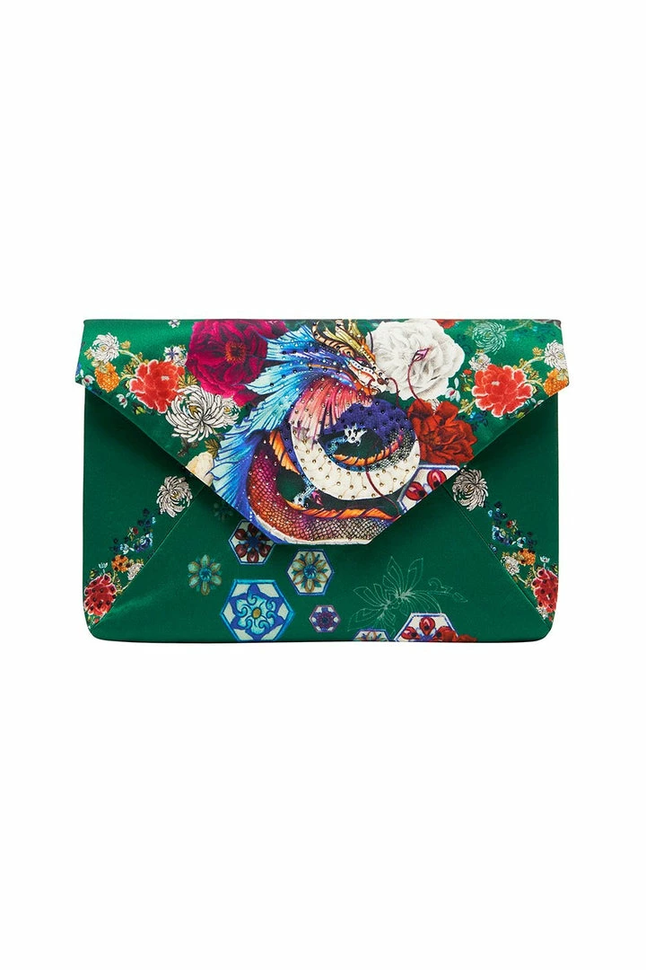 As an opulent collector’s purse, the Emerald’s Orbit Envelope Clutch is majestic with artisan craftsmanship. Designed with a rich emerald tapestry that plays backdrop to a scene of hand-painted florals and dragons, this luxurious clutch features buttery-soft quilted lining, an internal zip pocket for safe keeping, a magnetic snap fastening and is finished with CAMILLA artisan hand embroidery and embellishments. A true masterpiece, this purse will act as an unwavering statement to any formal look.