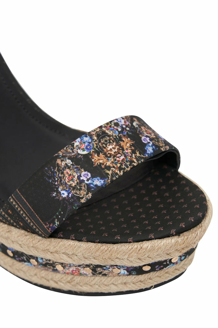 The Palace Playhouse Espadrille Wedge is a lavish CAMILLA summer shoe complete with printed canvas upper decorated with a decadent scene of Baroque excess, rich in vintage florals and gilded architectural highlights. The intricate rich black print is beautifully juxtaposed with a textual plaited jute contrast. A leather sock lining and adjustable ankle strap add practicality whilst hand-placed CAMILLA crystals elevate this casual summer wedge. Wear with any piece from the Palace Playhouse collection and radiate luxe resort elegance on your next sunlit summer occasion.