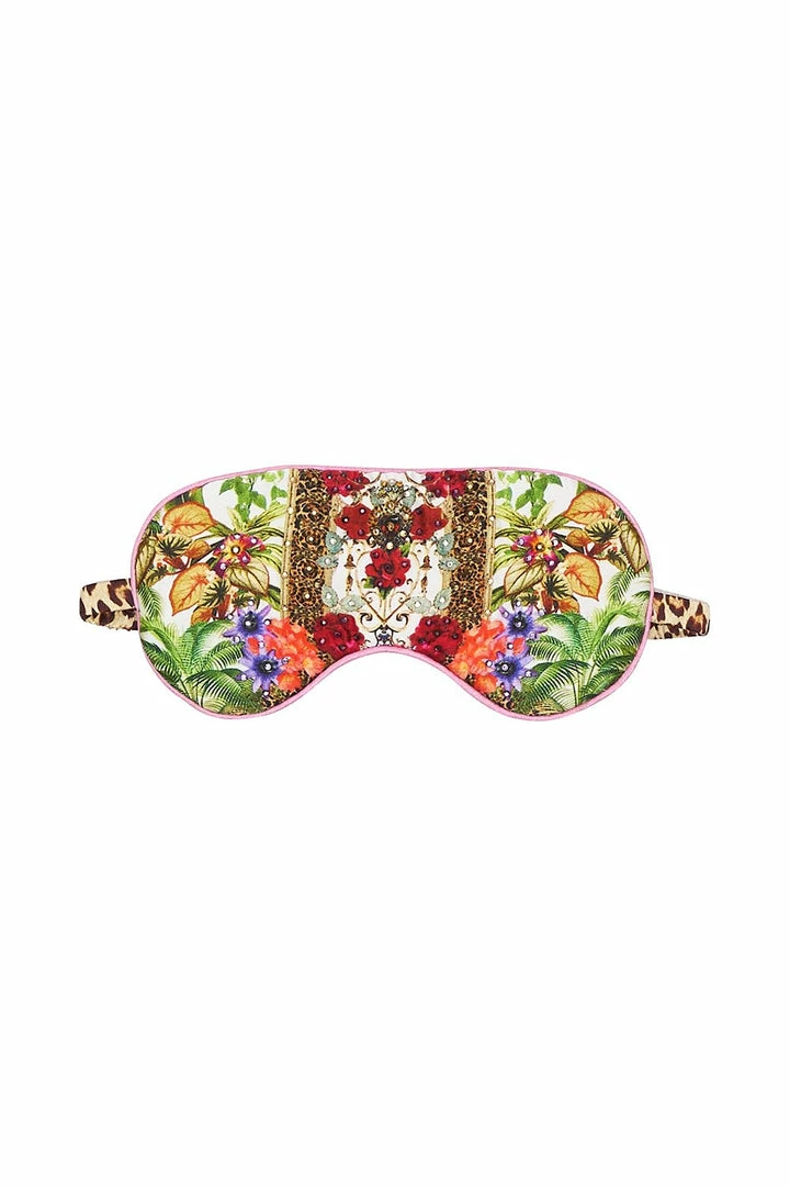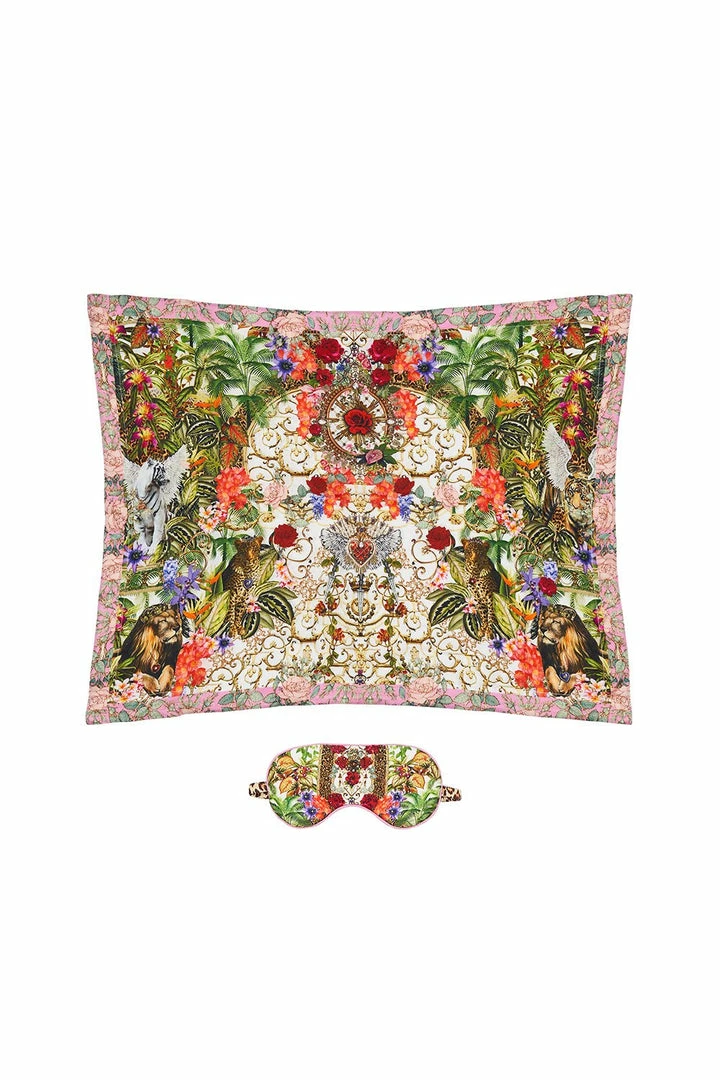 A decadent bedtime pairing for lovers of beauty sleep, the Fair Verona Eye Mask And Pillow Set is a wondrous story of love, loss and yearning. A pure silk standard sized pillowcase tells us of a star-crossed couple forbidden from realising their destiny. The opulent tropical print hides a cast of whimsical crowned characters; our winged protagonists amongst them. A matching eye mask mirrors the lush garden scape with added CAMILLA crystal embellishment for a luxe night-time note. A gift for your love, or a treasure for yourself, the soft silk offers nourishing protection for hair and skin – sweet dreams awake.