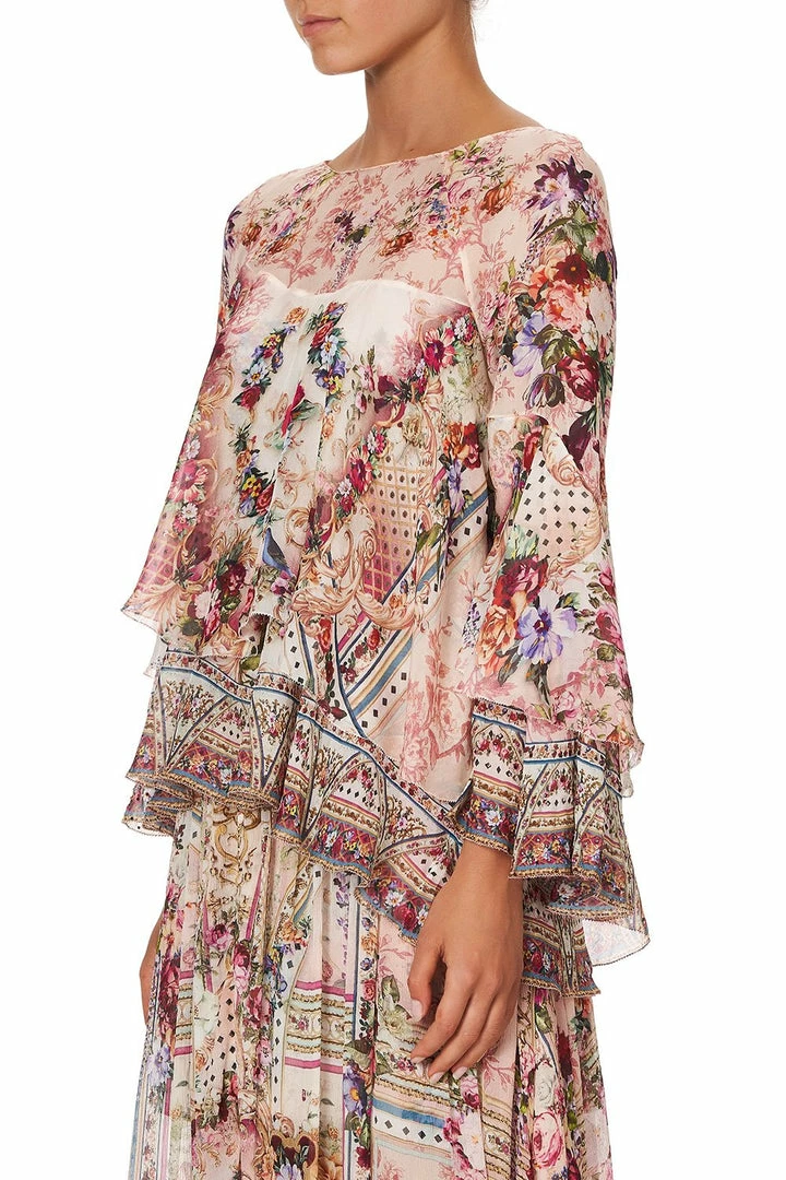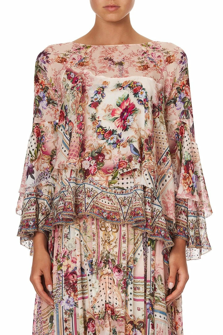 The asymmetric ruffles cascading down the body and sleeves of the Summoned By A Rose Flared Layered Blouse whisper scandalous secrets from one tier to the next. Inspired by the sweet seduction of tea room gossip, this printed silk blouse celebrates a floral explosion of soft pink tones and blossoming roses. Crafted from pure CAMILLA silk, this statement top features a sweet keyhole neckline at the back, created by delicate rouleau ties. Hand-placed CAMILLA crystal embellishment adds a final flourish of luxe, glistening with the joy of a freshly shared secret. Style back with matching Summoned By A Rose Shaped Waist Skirt for a floaty bohemian look.