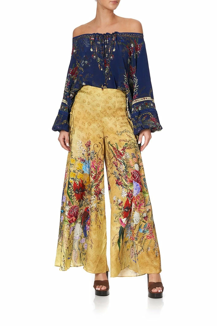 With native floral flourishes blooming across a sunburnt mustard landscape, the Among The Gumtrees Flares with Lace Up Side are perfect for weekend escapes and sunset revelries. Inspired by Australia’s beautifully obscure and diverse wildlife, these luxurious silk trousers feature lace up side ties, contrast godets, digitally printed silk, as well as hand-placed crystals as detail.
