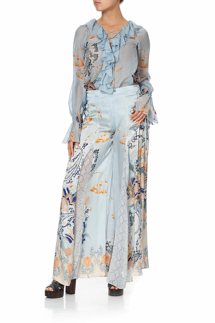 These luxurious pure silk trousers feature lace up side ties with seasonal CAMILLA beaded tassels, contrast sheer godets.