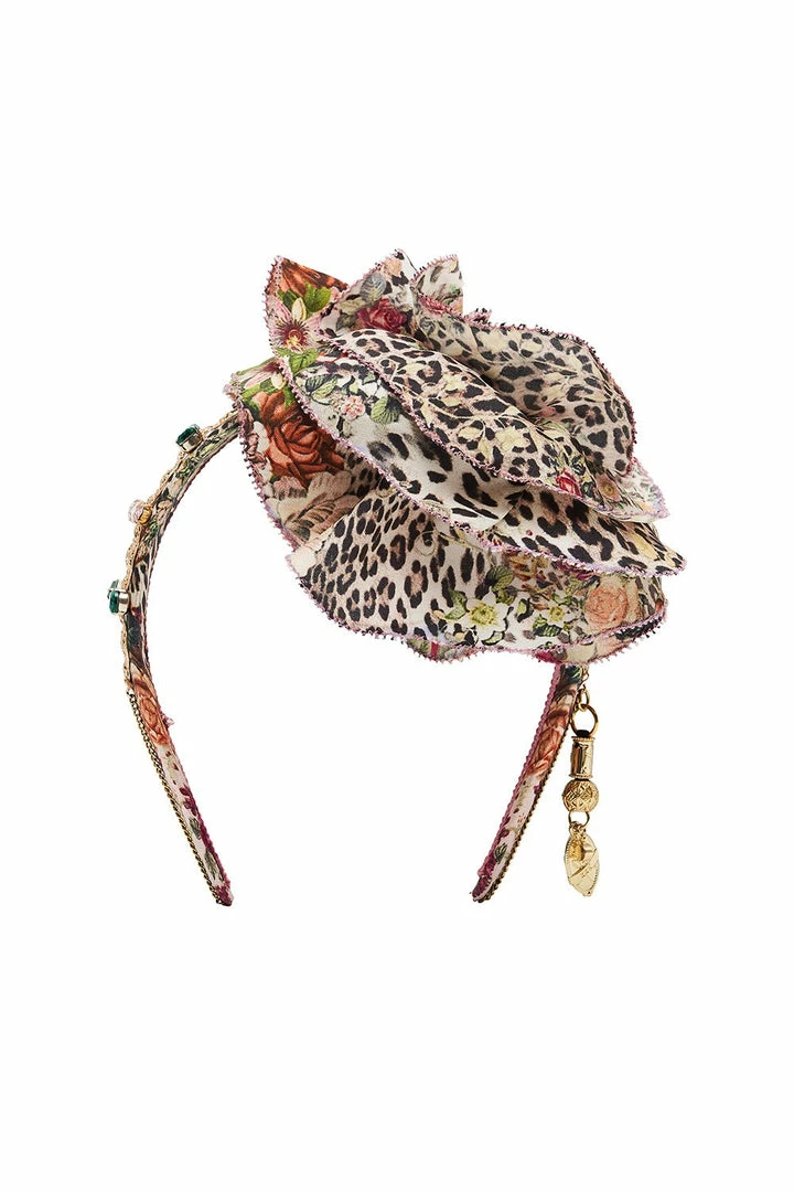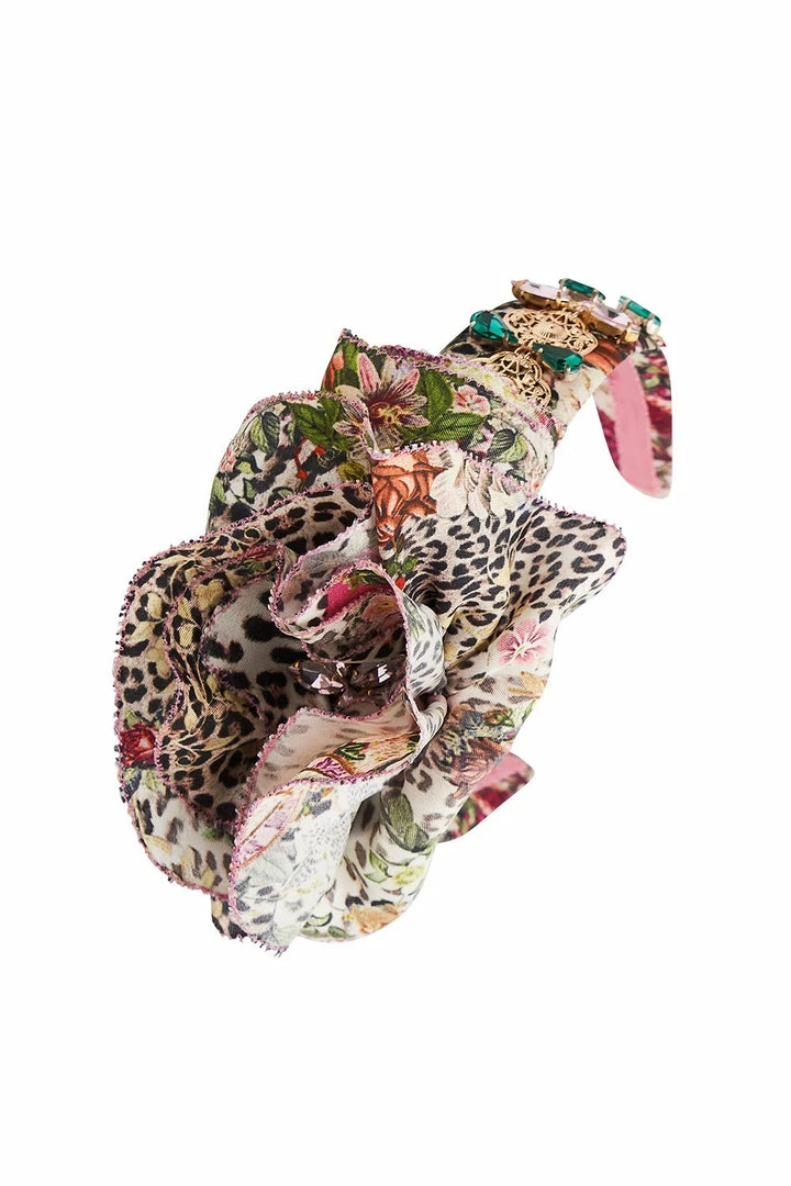 Bring earthly inspiration to the wardrobe with the Anarchy At Annabels Flower Headband. An ode to the plush pink powder rooms that define the London high society club Annabel’s, lavish interiors are echoed in signature CAMILLA print pillars. Ivory leopard print lines the silk as hand-illustrated botanicals adorn the headpiece in hues of peaches and cream. This luxury headband features signature crystals, a golden tassel charm and a delicately ruffled flower detail.
