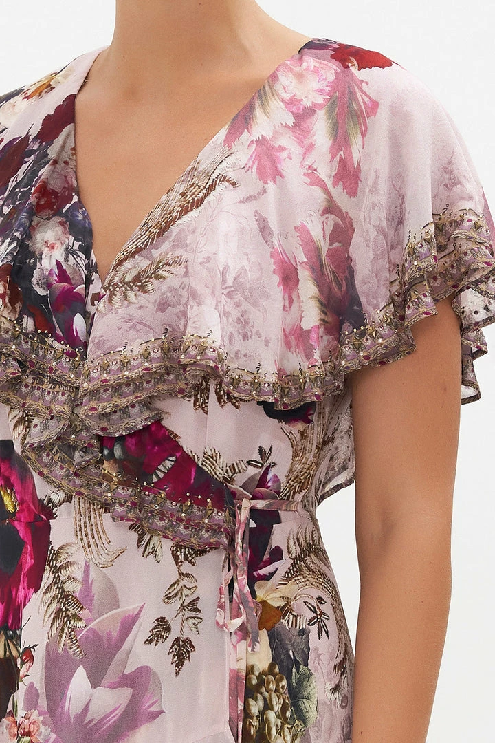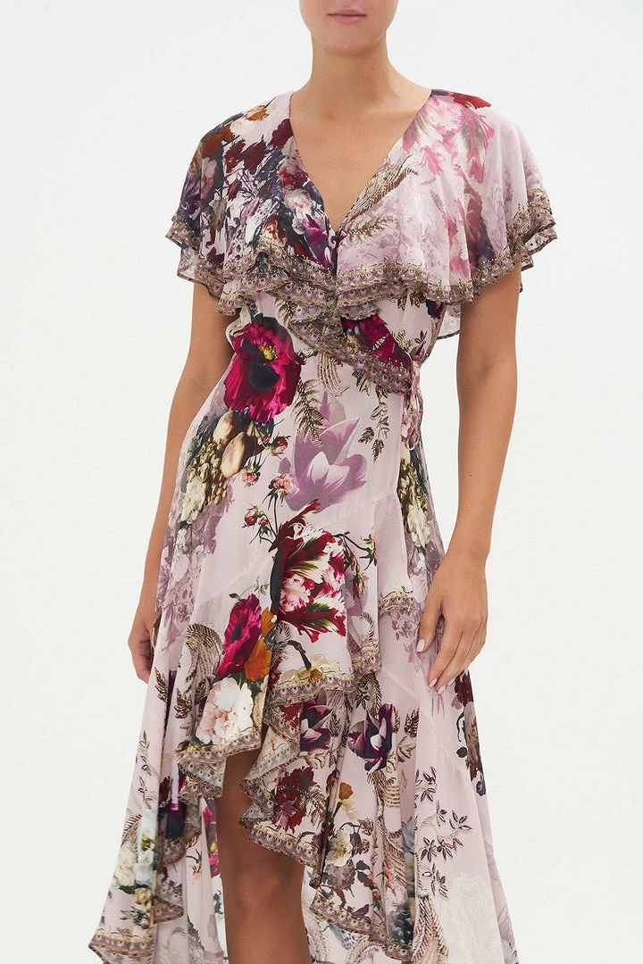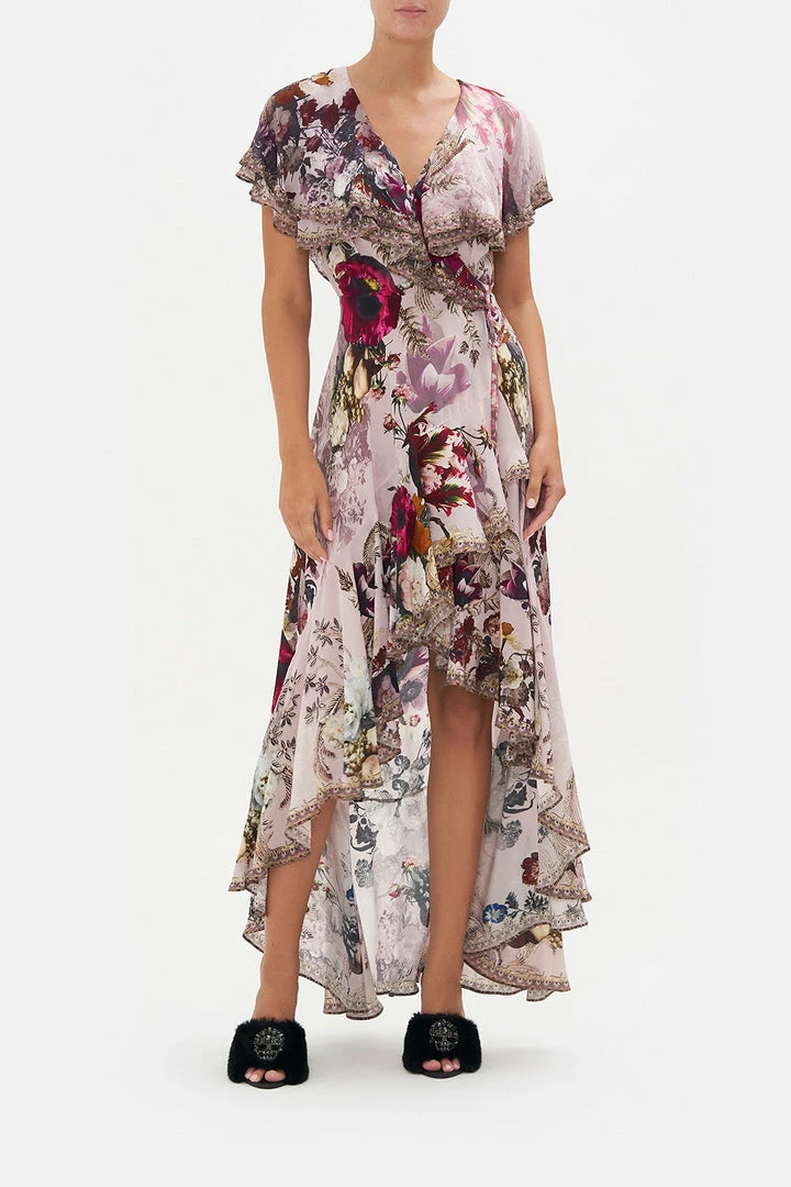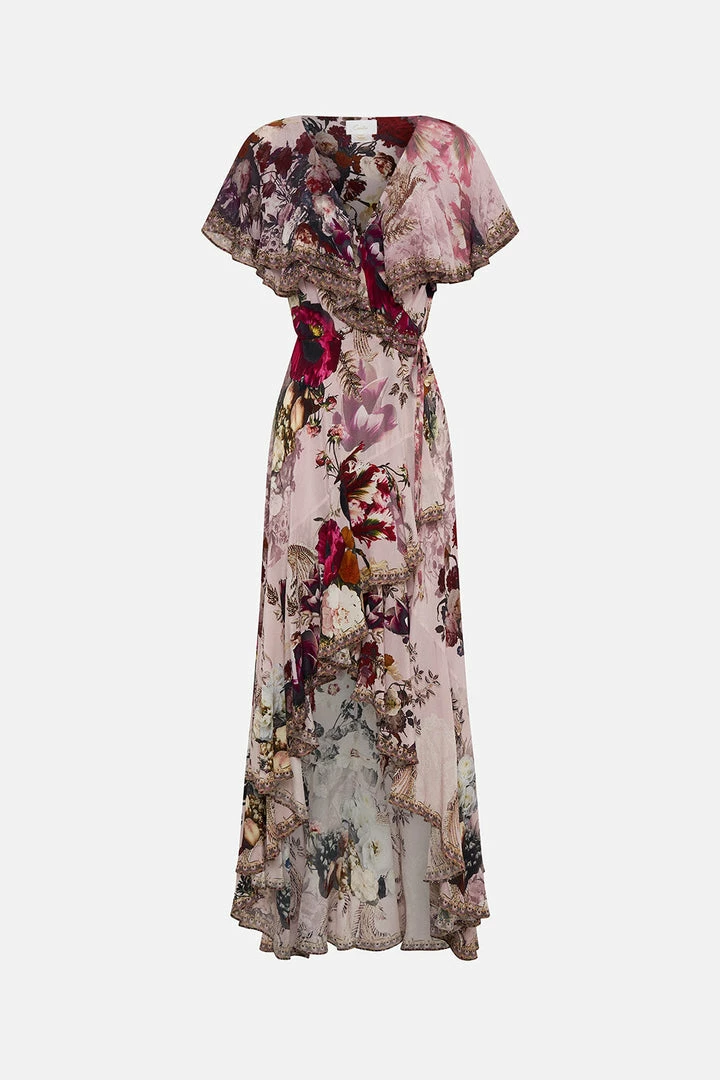 Calling to the romance of sun-soaked gardens, the Gyspy Rose Sleeve Long Dress is encased by muted mauve tones enveloped by intertwining vines and cascading botanicals in hues of raspberry and gold. Crafted from signature CAMILLA silk, this luxury dress features a wrap-style silhouette that pulls the waist in, matching panelling at the hems, frill details and a high-rise cut that elongates the legs.
