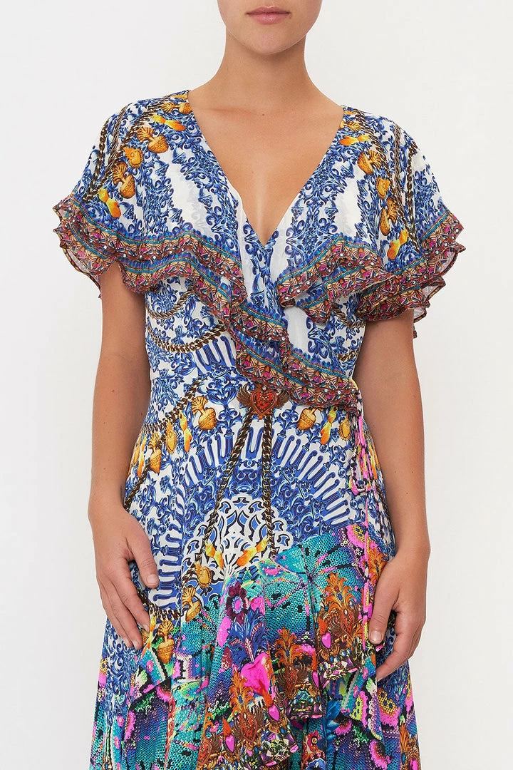Infused with romantic nods and neon majesty, the Lucky Charms Frill Sleeve Long Dress captivates the eye with a vivid mosaic spotted with fuchsia moments, seas of aquamarine, golden amulets and the face of Frida. Crafted from signature CAMILLA, the cross-over silhouette pulls the waist in and a high-rise cut elongates the legs. For the finishing touch, consider a gold or silver drop earring to tie your look together.