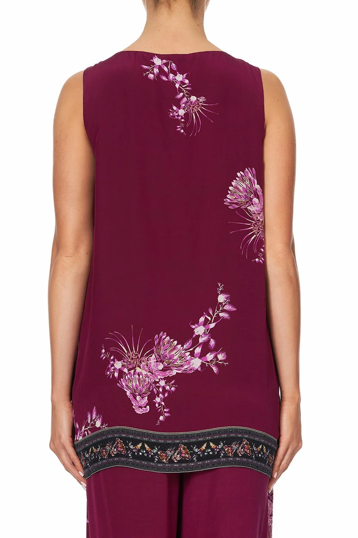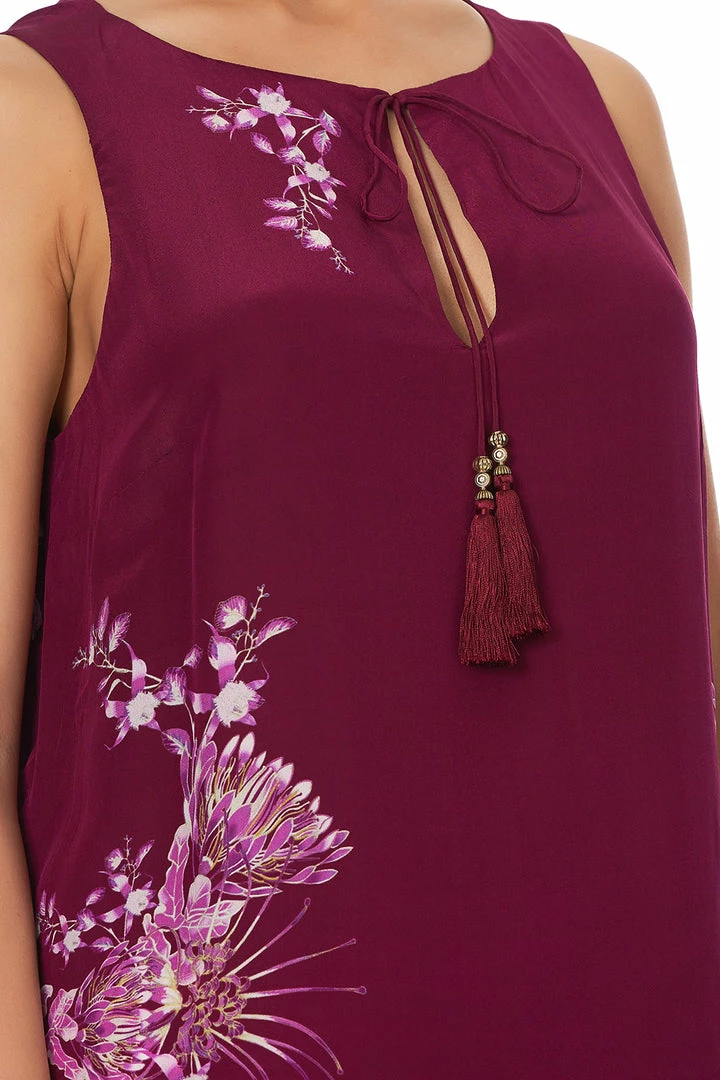 Casually elegant sleeveless top, the Desert Sunrise Front Split Tunic is crafted in a heat wave of berry toned silk with floral framed edging in tribute to our motherland and her palette of natural beauty. This pure silk tunic top features a flattering round neckline, gentle lightweight tie closure with CAMILLA beaded tassels, side splits, subtle high low hem and hand placed crystal embellishments glistening along the hemline.