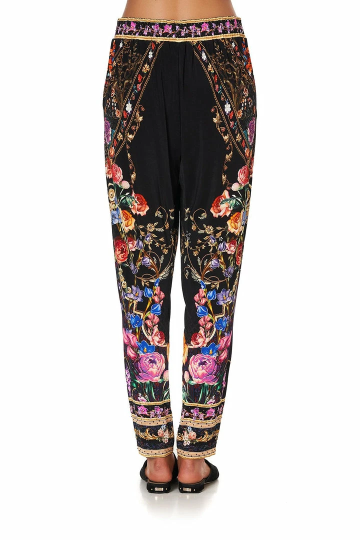 A printed pant rich with decadent accents, the Blushing Manor Harem Pants With Front Pleats gives laid-back styling a luxe edge. Inspired by a wild English rose enchanted by nightfall, a backdrop of dark black is lifted with bright floral highlights and hand placed CAMILLA crystal embellishments. Crafted in a soft stretch jersey, these harem pants are styled in a relaxed fit with a wide waistband, pockets and pleating at the front. Embrace a smart-casual aesthetic and wear back with the matching Blushing Manor V Neck Jumper With Print Back.