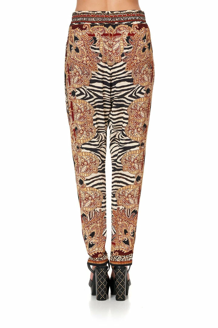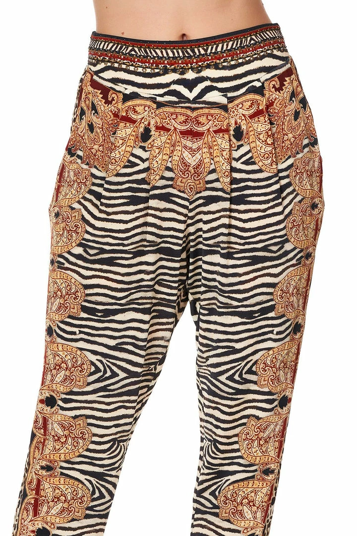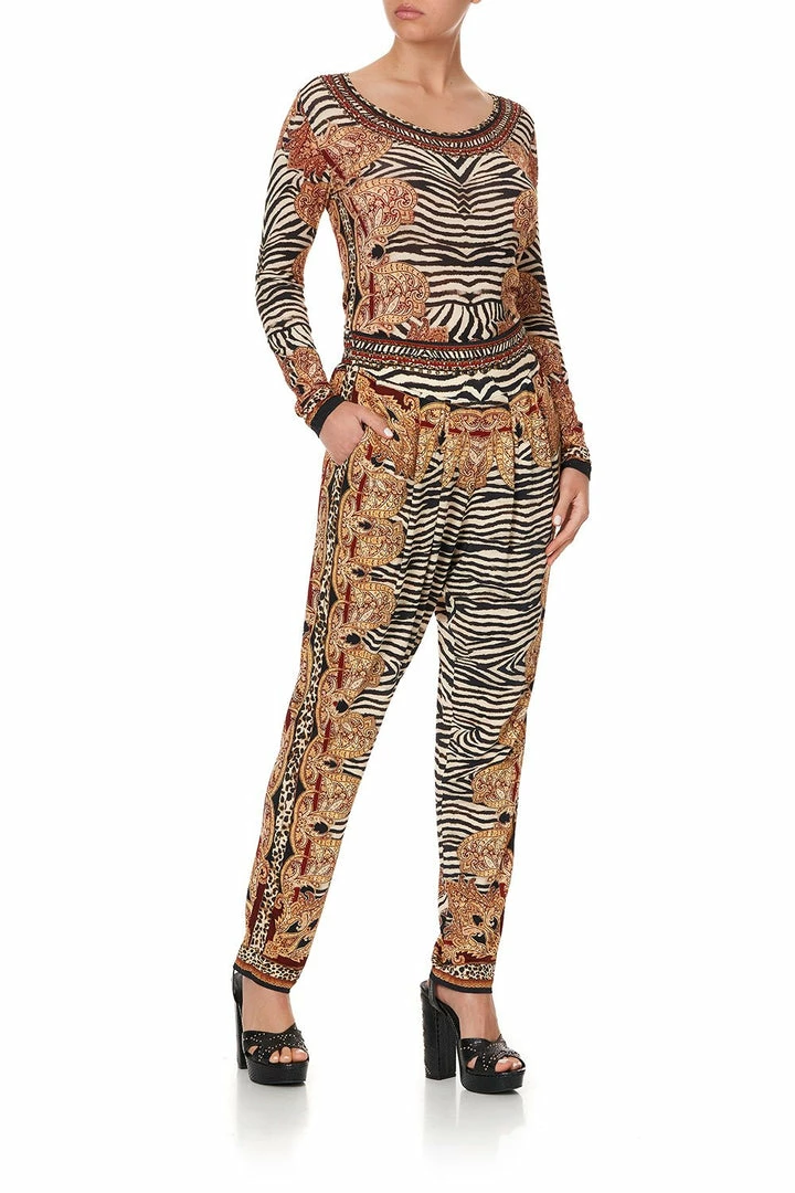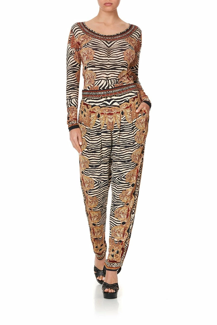 Opulent gold paisley contrasting with fierce animal textiles, the Wild Fire Harem Pants with front Pleats have a print reminiscent of folk art and rich Russian lounge hues. Crafted in a soft viscose jersey, these harem pants feature a relaxed fit, a wide waistband, front pockets, pleating at the front and hand placed CAMILLA crystal embellishments. Pair with the Wild Fire Long Sleeve Fitted Top on a cosy winter night by a roaring fire.