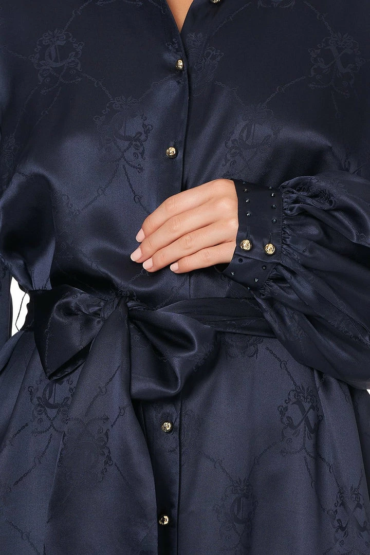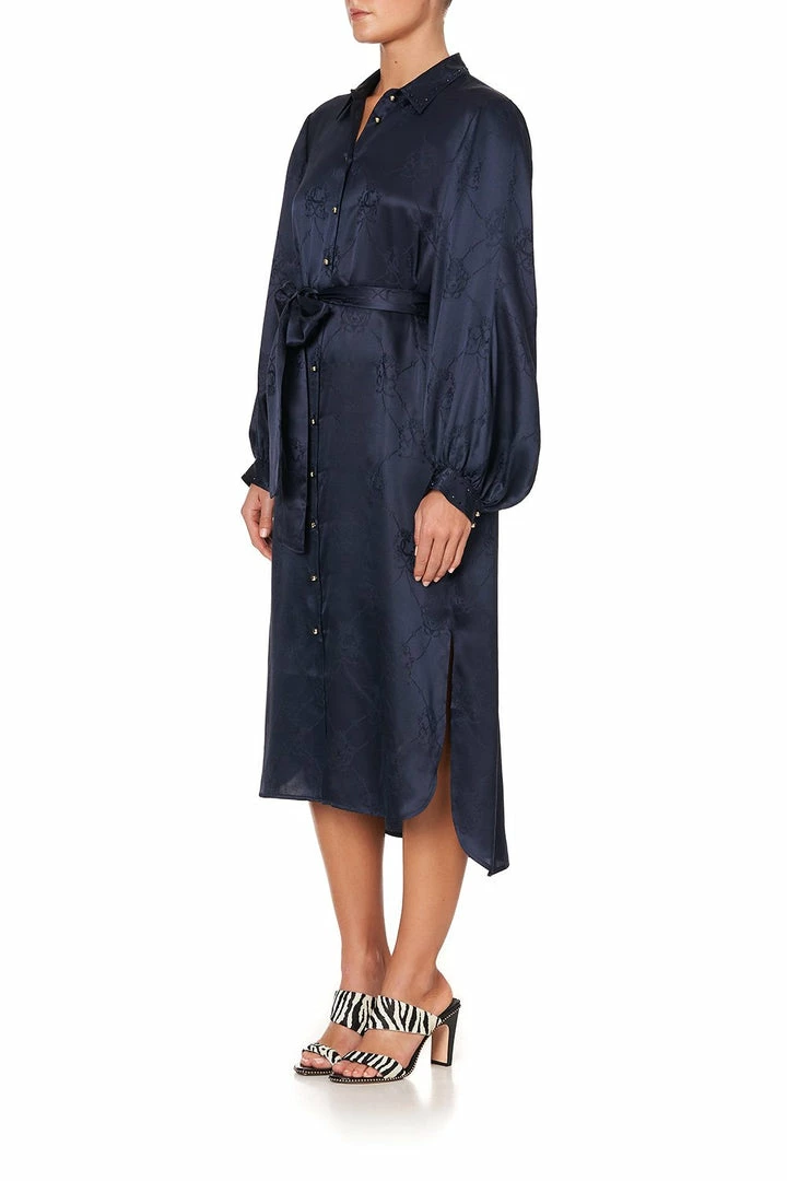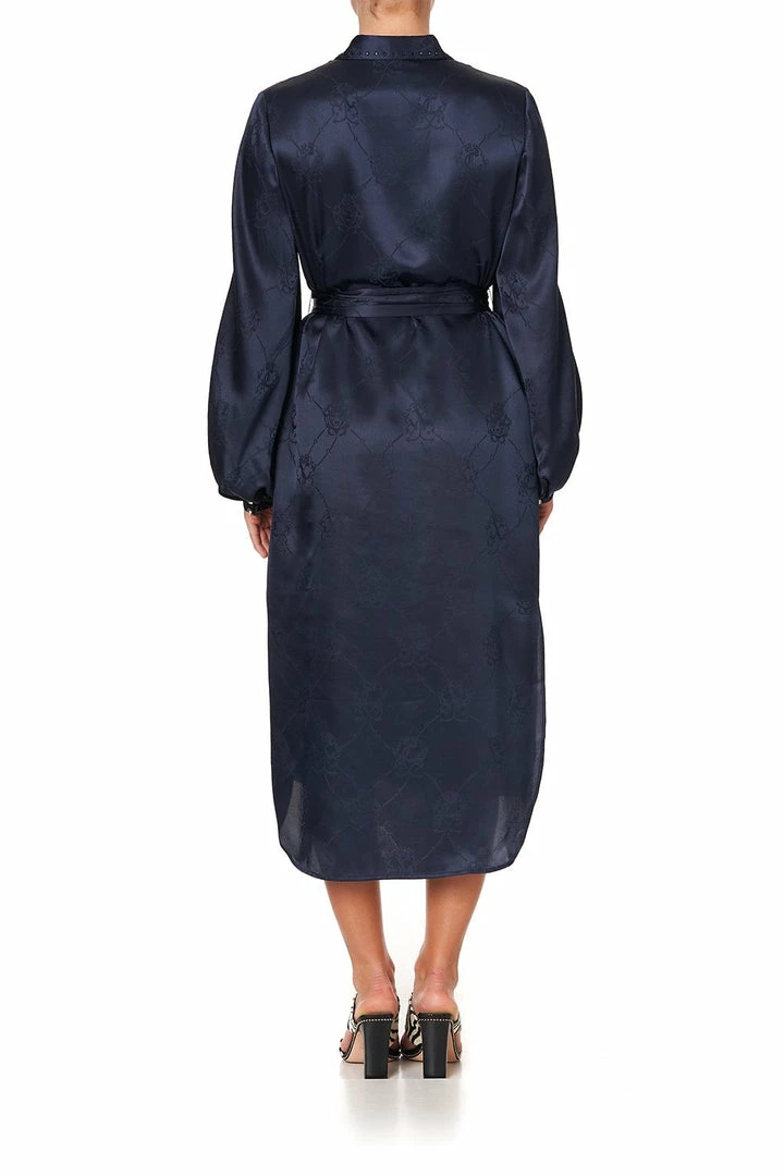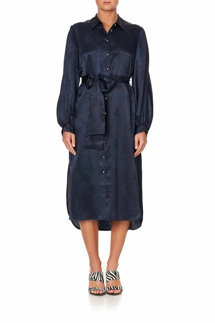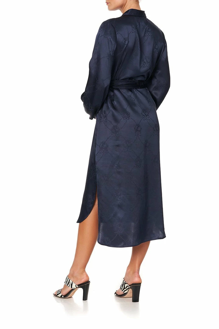 The epitome of elegance, the Solid Navy High Low Midi Shirt Dress is a modest silhouette with luxurious styling. Inspired by dynasties past, an opulent navy canvas of pure CAMILLA silk is decorated with a striking new jacquard design enchanted with tiger heads and CAMILLA motifs. Styled with a crystal embellished collar and cuffs, blouson sleeves and button front closure, this silk dress is designed in a relaxed fit with side splits for effortless movement. Timelessly stylish, we love to pair this shirt dress back with playful heels and statement earrings.