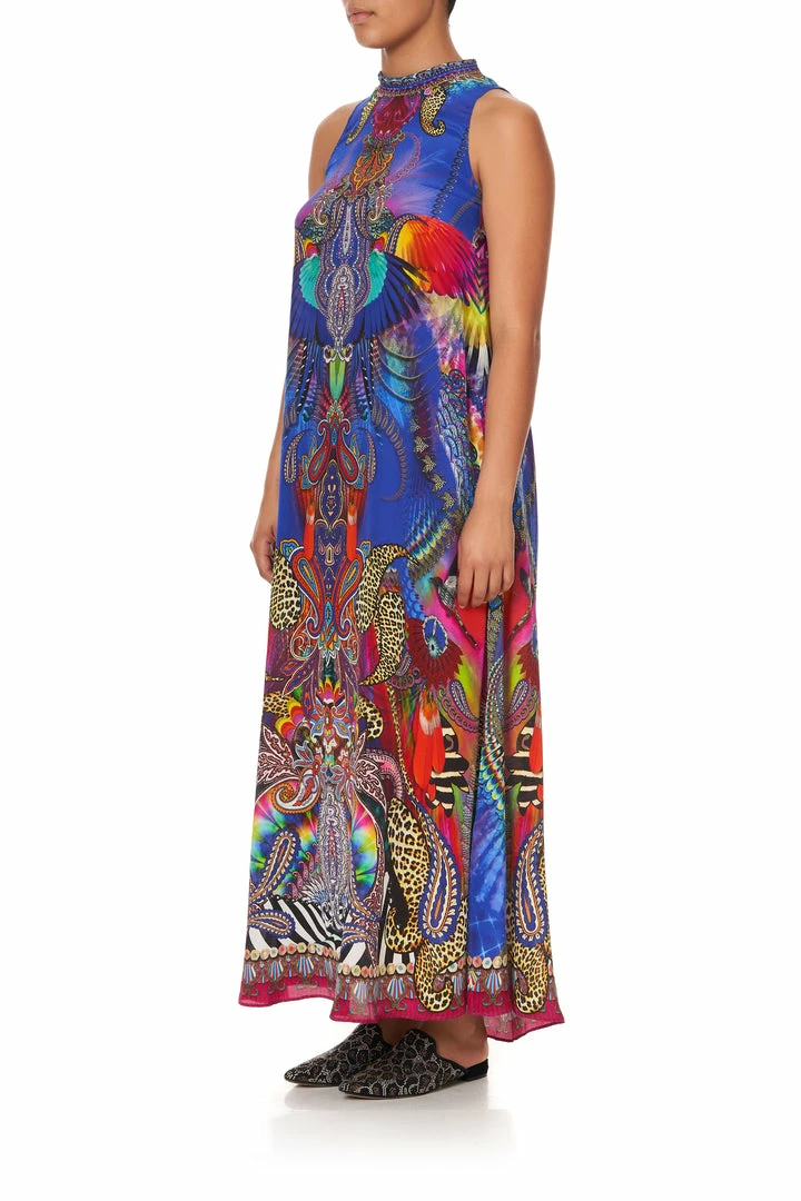 Cut in a trapeze silhouette, the Psychedelica High Neck Dress With Back Neck Tie is a formal maxi dress crafted from pure CAMILLA silk. The high neck and lavish back tie radiate an air of elegance whilst the medley of rainbow hues and contrasting zebra print add a cheeky playfulness, inspired by a wild night of riotous chaos. Signature CAMILLA crystals enhance the luxe aesthetic whilst hidden pockets add practicality. Style with sky-high heels and statement earrings for your next formal evening occasion.
