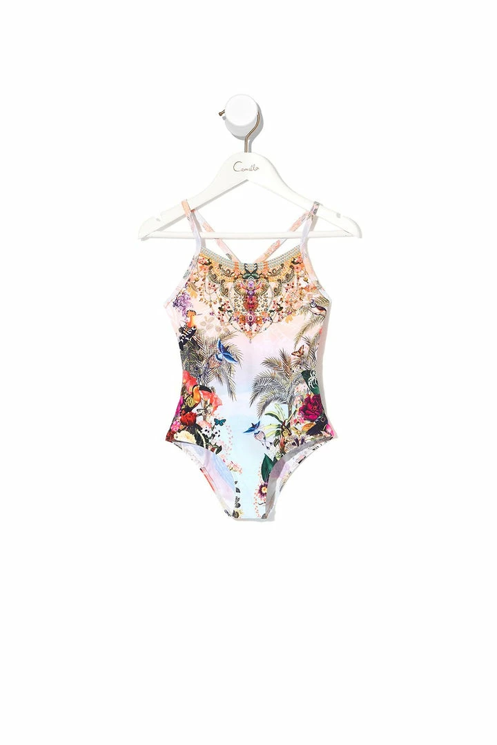 A swimsuit fit for the tiniest of sun chasers, the Gully of Jupiter Infants Round Neck One Piece is one for the vibrant beings. Following a printed diary of a whimsical space garden discovered in a deep dream state, these baby swimmers are crafted in an Italian Nylon Elastane and boast adjustable straps, cute cross back, playful all-over print, as well as resin crystal embellishment. A colourful swimsuit to make colourful memories in! All CAMILLA swim pieces are crafted with love to last and retains both colour and shape beautifully. To care for your CAMILLA swim piece, simply cold hand wash and dry flat.