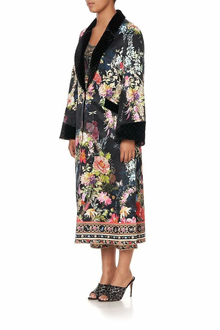 Proof that winter need not be dull, the Hampton Hive Jacket With Topstitched Detail teams digitally printed vibrant florals with a velvet quilted collar and cuffs. This lightweight woven winter jacket is lined and features split sides and discreet fastening. CAMILLA crystals add an additional kick for an outer layer that makes a statement.