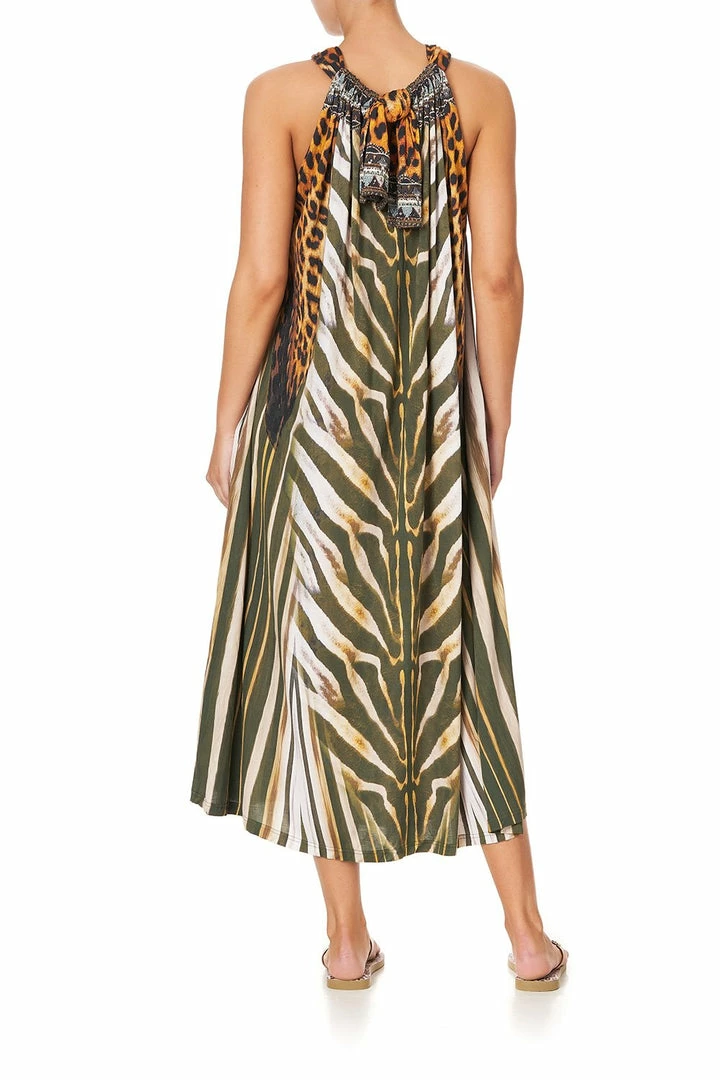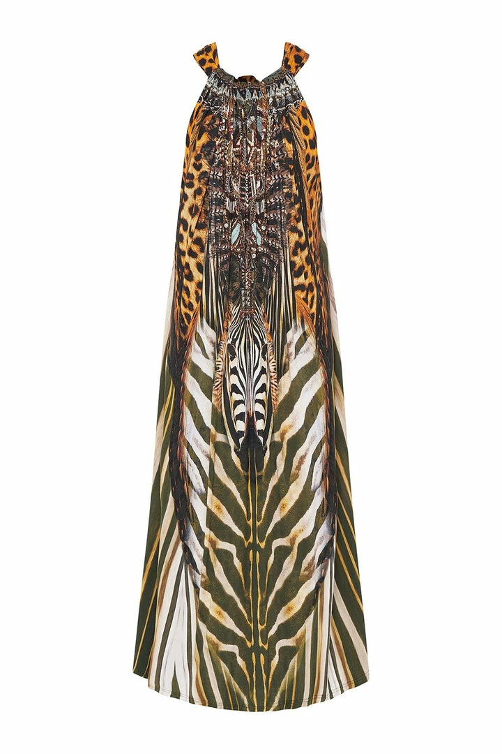 Relaxed and regal, the Nine Lives Jersey Drawstring Dress is crafted from soft modal fabric in a loose fit casual silhouette printed with khaki and golden tones punctuated by animal accents and hand-embellished CAMILLA crystals. Inspired by Camilla’s past travel journey, this luxe lounge dress features a back keyhole neckline and adjustable straps for playful styling. Pair with your favourite embroidered slippers from this season’s collection.