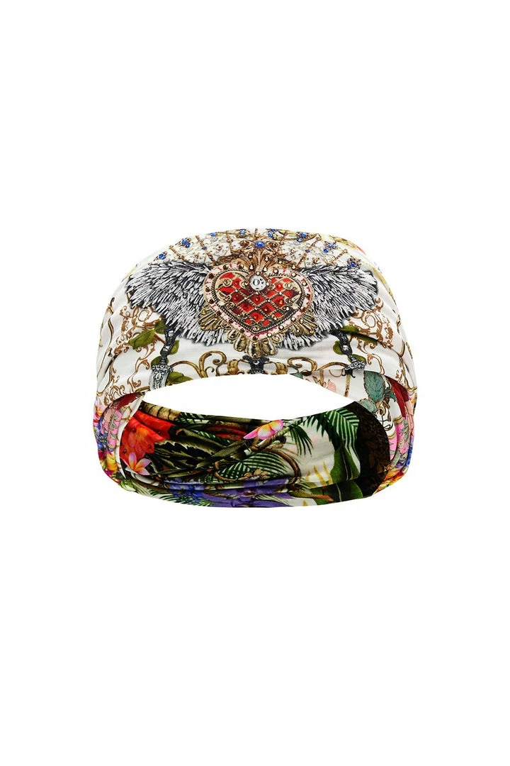 The vibrant crowning glory to your Fair Verona ensemble, the Fair Verona Jersey Head Wrap is an eye-catching piece of boho headwear. Adorned with whimsical characters, wearing crowns of their own, this fun turban style headband is inspired by a forbidden love story. A CAMILLA crystal embellished heart sits centre stage amongst the leaves of a vibrant tropical garden. Crafted from a soft stretch fabric for the perfect fit, this versatile headpiece can be worn out to lunch or with matching print swimwear for a resort statement.