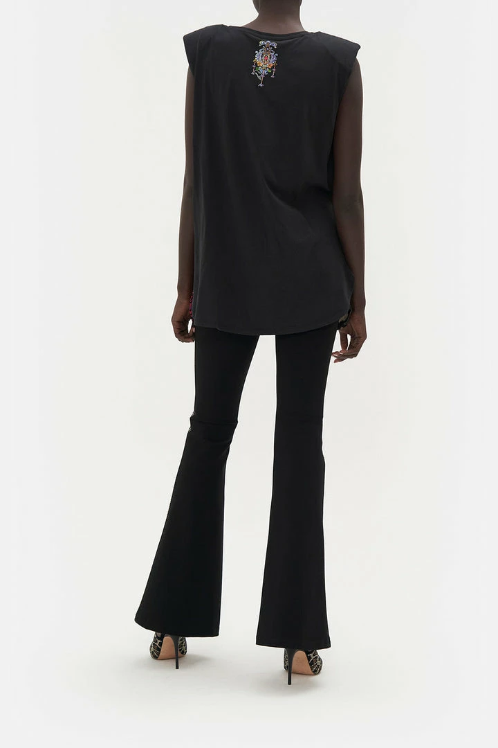 Luxe atheleisure wear dipped in a futuristic take to Pachamama, the Exotica Erotica Jersey Muscle Tank captures the gaze with midnight hues adorning magenta-dipped big cats, hand-embellished forest ferns and electric graphics. Complete with hand-embellished CAMILLA crystals, this luxury muscle tank features a relaxed sleeveless silhouette, a crew neckline and an easy slip-on style.