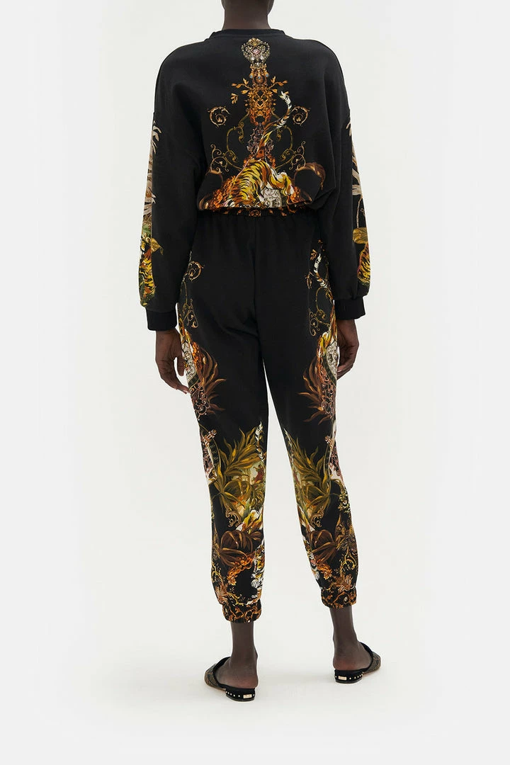 Enwrapping you in golden swirls of ornate wild majesty, The Queens King Jersey Track Pant With Pocket calls to an intricate mosaic of tigers stalking a sea of midnight, baroque accents and leafy details dipped in utter opulence. Adorning hand-embellished CAMILLA crystals, these luxury cotton track pants feature a relaxed silhouette, a contrasting waistband that features elastication, a tapered hem and drawstring accents for your most perfect fit.