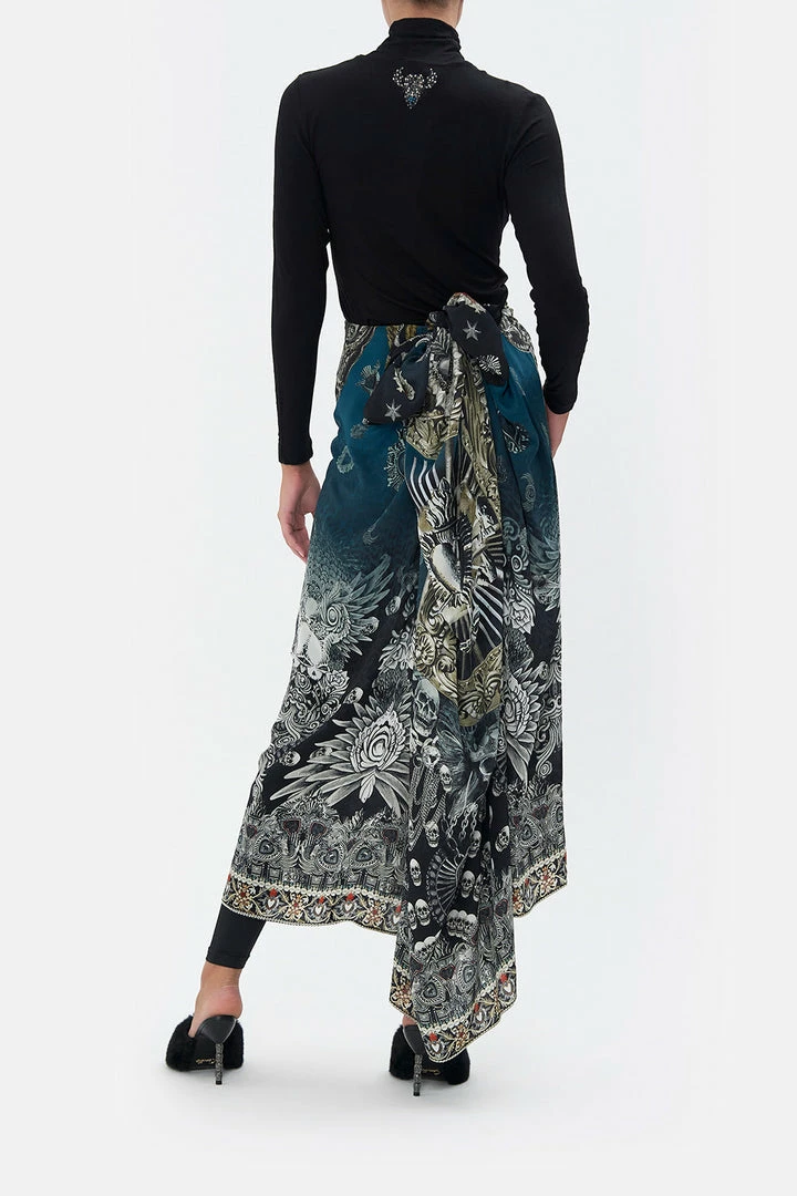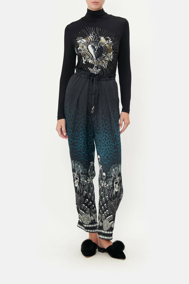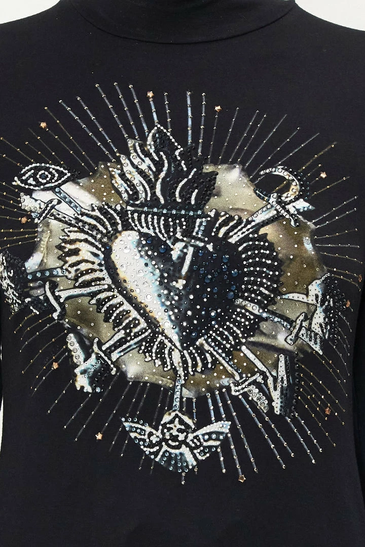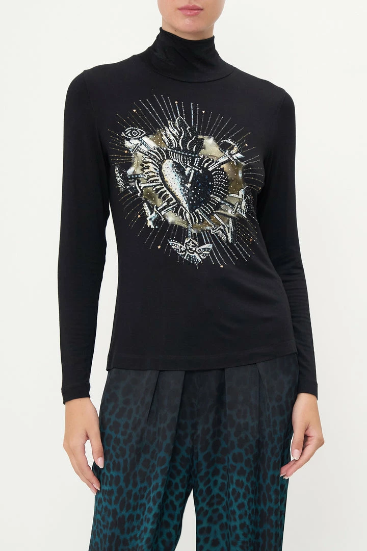 Elevated winter essentials taking a dip into the richness of Mexico, the Animal Anarchy Jersey Turtleneck is encapsulated in midnight hues adorning striking metallic heart amulets and hand-embellished CAMILLA crystals. Crafted from a soft jersey, this luxury turtleneck features a full sleeve, a fitted bodice that hugs your waist and curves, a high neckline and a silhouette that falls effortlessly to the hip. Style with denim for an elevated everyday moment or pair back with leather trousers for evening perfection.