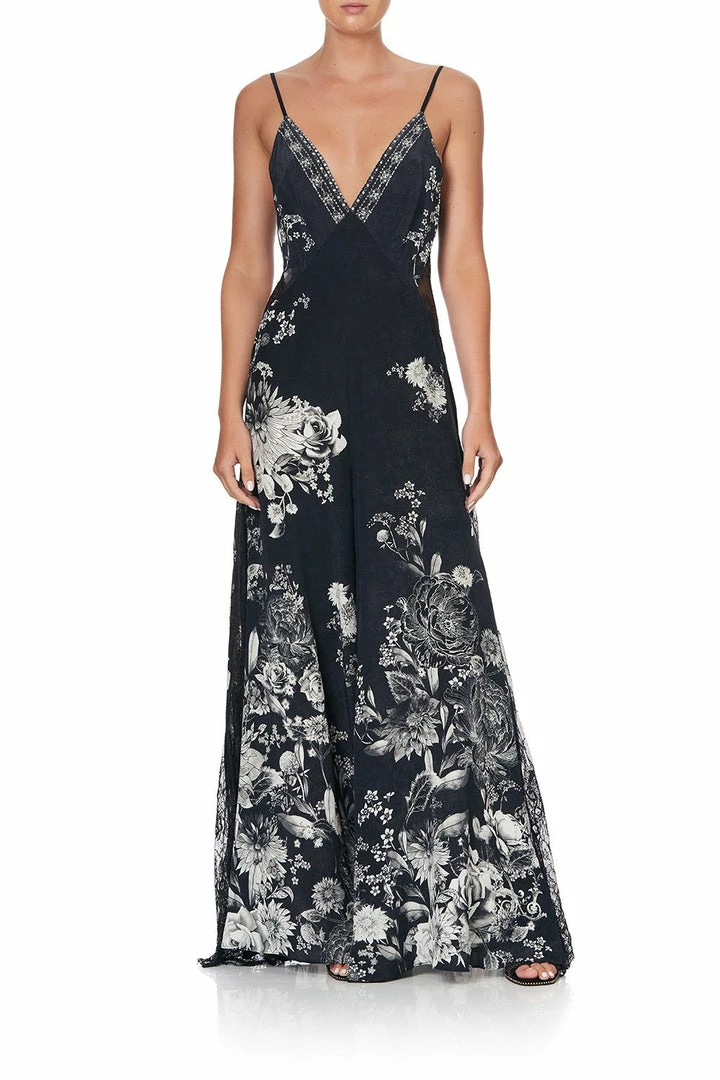 A divinely 70s statement jumpsuit silhouette reimagined, the Moonshine Bloom Jumpsuit with Lace Insert embodies is effortlessly chic. Crafted with a printed silk reminiscent of dainty ancient Chinese garden blooms flourishing under a midnight moon, this feminine form-fitting one piece features an alluring deep v-neckline, flirty sheer lace panels, retro flared legs and is finished with hand-applied CAMILLA crystals. A statement piece for any event, opt for chunky heels for a retro vibe.