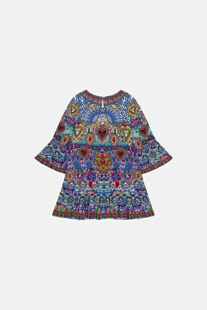 Ruffles dipped in neon majesty, the Lucky Charms Kids A-Line Gathered Dress 12-14 is a vivid mosaic spotted with fuchsia moments, seas of aquamarine, golden amulets and the face of Frida. Crafted from light rayon, this luxury kid’s dress plays host to wide statement sleeves that fall into a ruffle, a matching frilled hemline and a relaxed shift-style silhouette.