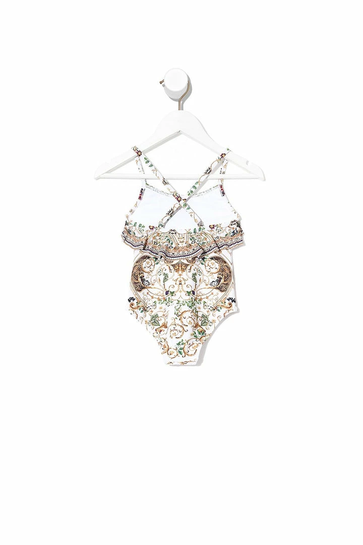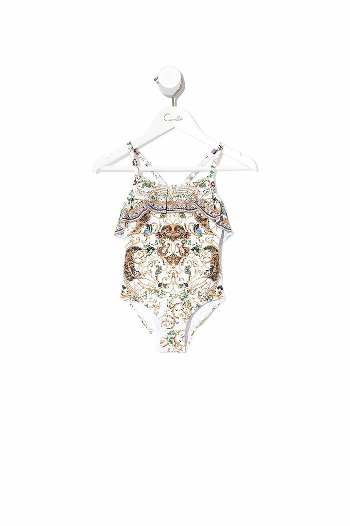 Striking full piece, the Night Waiting For Day Kids Neck Frill One Piece is proudly exposed in bold gold and zebra accents inspired by the goddesses who never looked outwards for cues, but found their true calling from within. This Italian lycra printed swimsuit features a charming frill to the front and back, adjustable crossover straps, round neck and carefully scattered signature CAMILLA resin crystal embellishments.