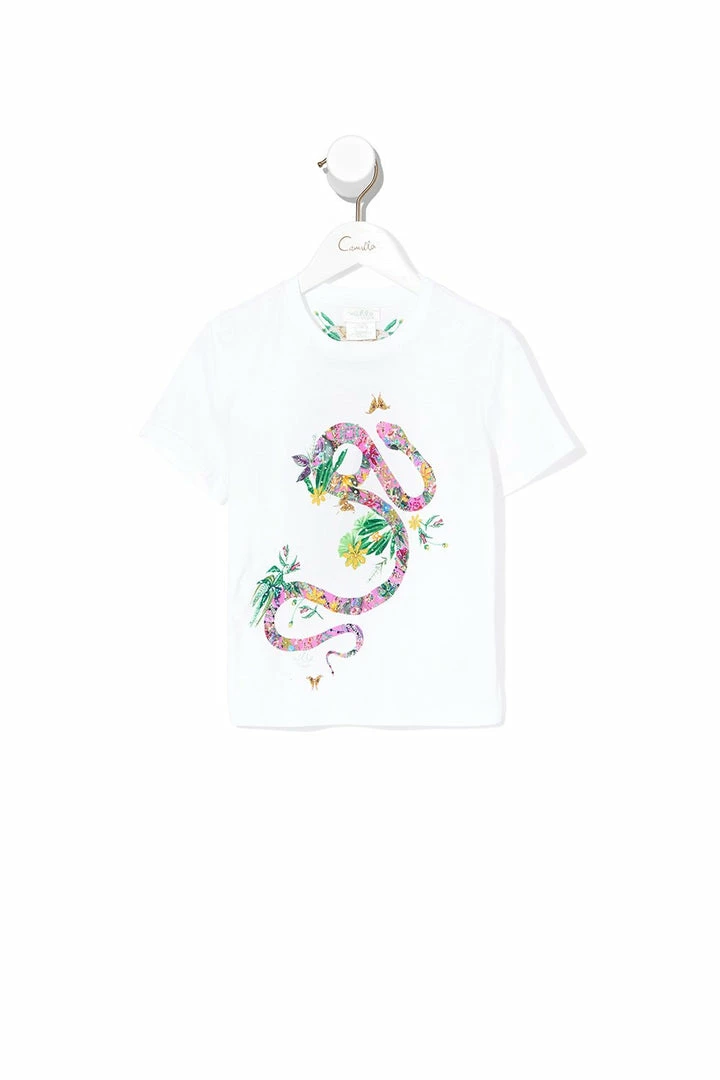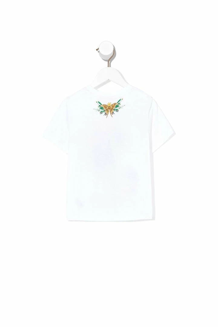 Embodying the spirit of adventure, the Daintree Darling Kids Short Sleeve T-shirt is a playfully plush tribute to the mystical depths of the Daintree Rainforest. Boasting a vibrant feature placement print, it features a ribbed neckband and a glittering array of resin crystal embellishments. Wear with matching skirt for a sugary sweet look.