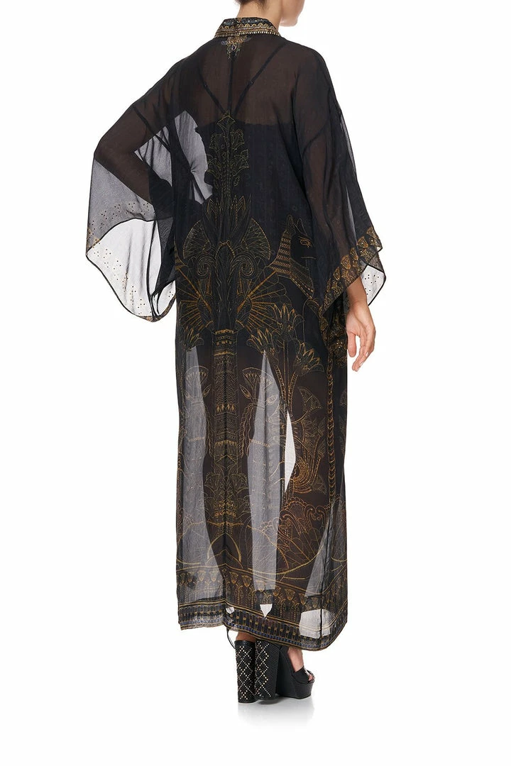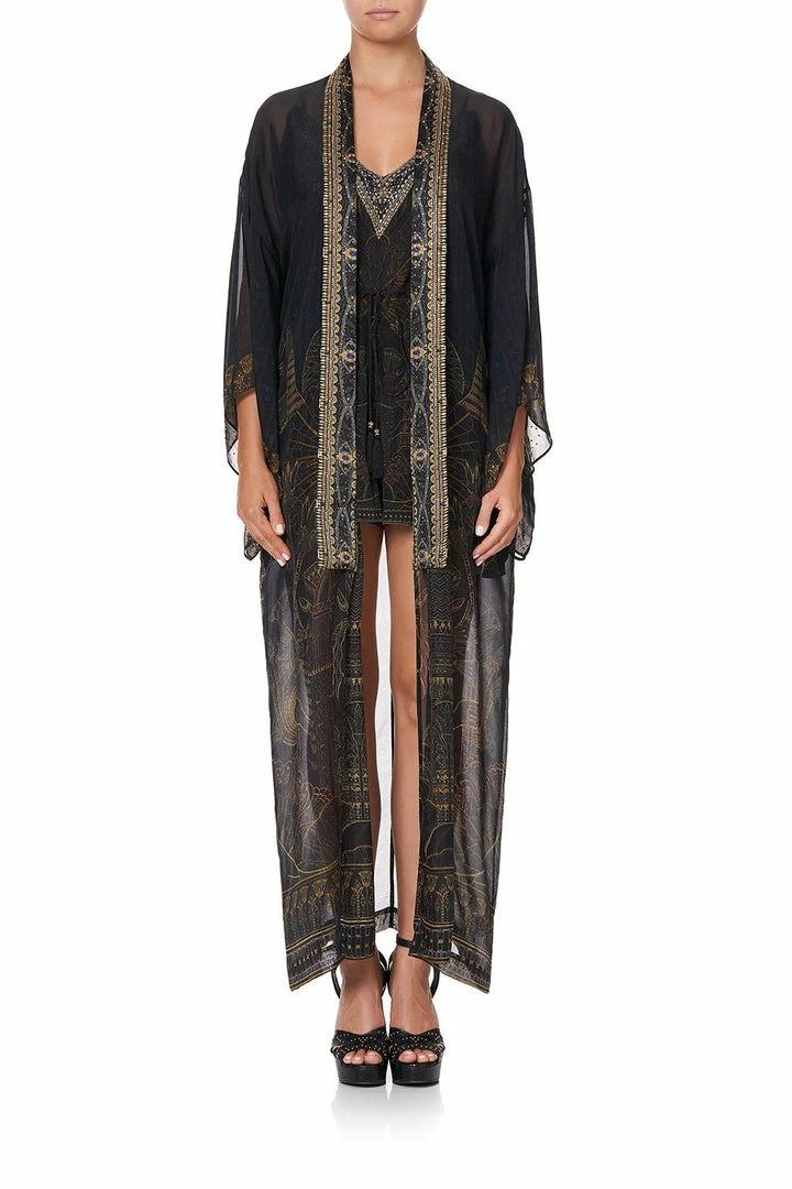 A sweeping masterpiece inspired by vintage kimonos uncovered at markets around the world; the Cobra King Kimono Coat is boldly bohemian. Crafted using a divine CAMILLA print referencing ancient Egyptian animals against a midnight backdrop, this striking floor length coat features hypnotic 70s era sleeves that fall beside its relaxed fit. Finished with hand applied CAMILLA crystals, pair over matching V Neck Shoestring Strap Playsuit for days wandering vintage markets.