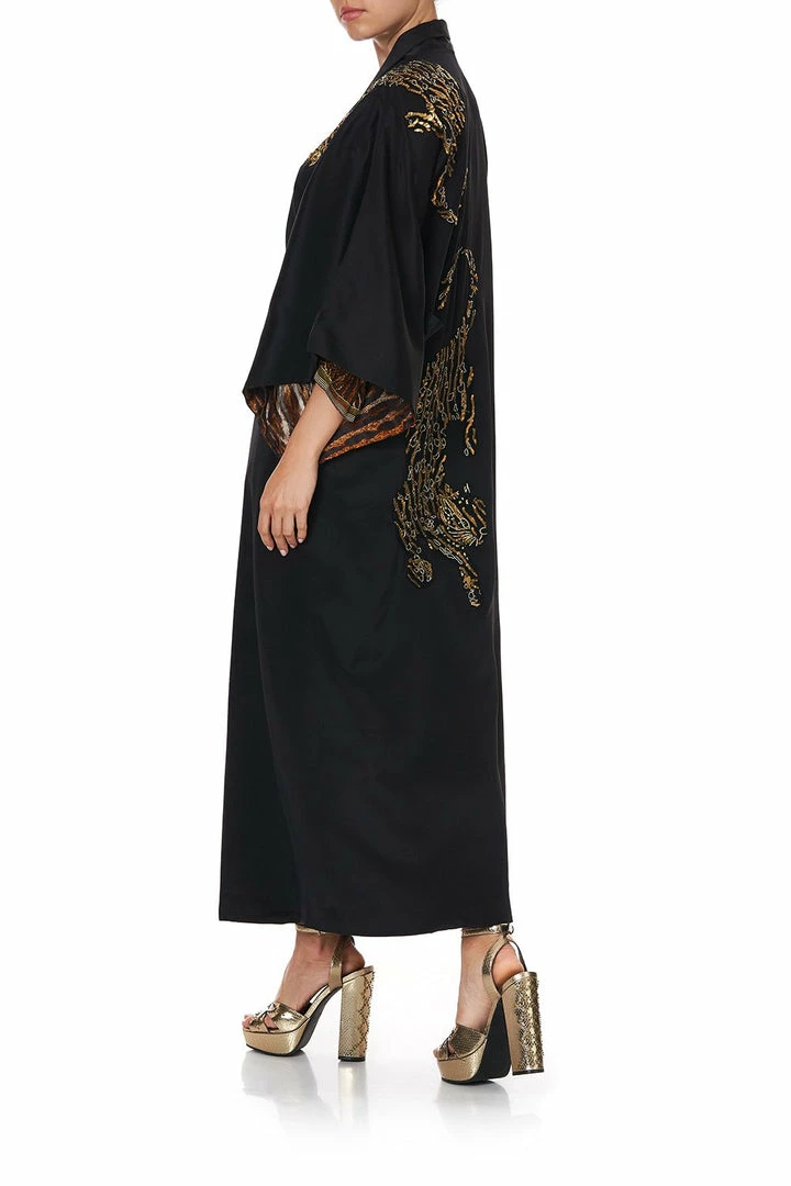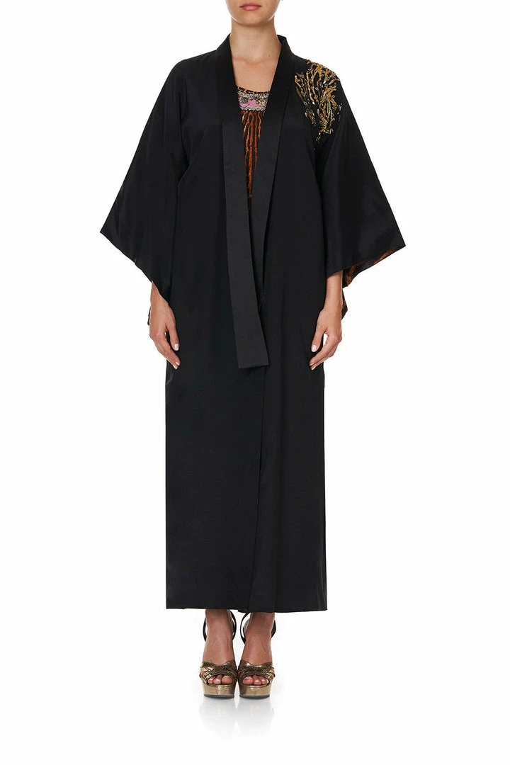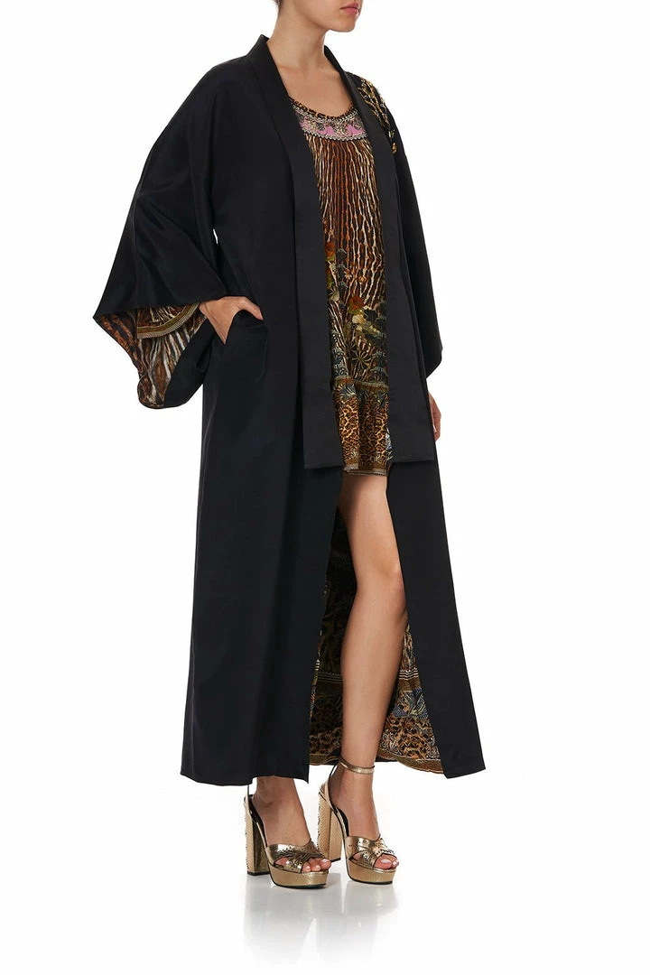 A sweeping bohemian leopard print coat, the Wild Azal Kimono Coat is divinely statement in all its glory. Made with love using a striking golden colourway referencing Persian folklore, this striking floor length coat features dreamy kimono sleeves that fall beside this relaxed fit leopard print jacket. Finished with hand applied CAMILLA crystals, this piece can be styled over the matching A Line Frill Dress.