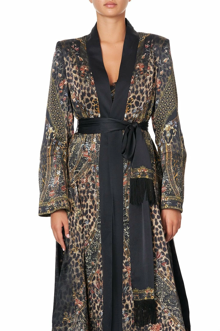 Be irresistible in the Abingdon Palace Kimono Coat with Splits, a decadent canvas of gilt designs across a bed of leopard print, inspired by the famous ornamentation of London’s Biba Boutique. This silk kimono robe is cut in a flattering silhouette with wide sleeves and punctuated with a contrast belt and collar. Too pretty to be reserved just for relaxing at home, this playful loungewear is infused with a couture feel that begs to be layered over complementary prints from this season’s edit.