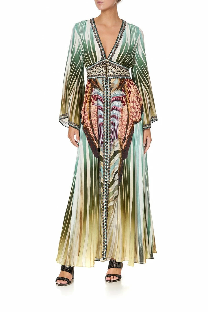 With daring green zebra stripes and accents of pink hues, the Up On Cloud Nine Kimono Sleeve Dress With Shirring Detail is crafted from pure CAMILLA silk reminiscent of Camilla’s past travel journey. This form flattering dress features a buttoned front and a V neckline adorning the décolletage and a shapely shirred elastic waistband. Radiating with hand-embellished CAMILLA crystals, this divine dress shines when paired with glimmering jewels.