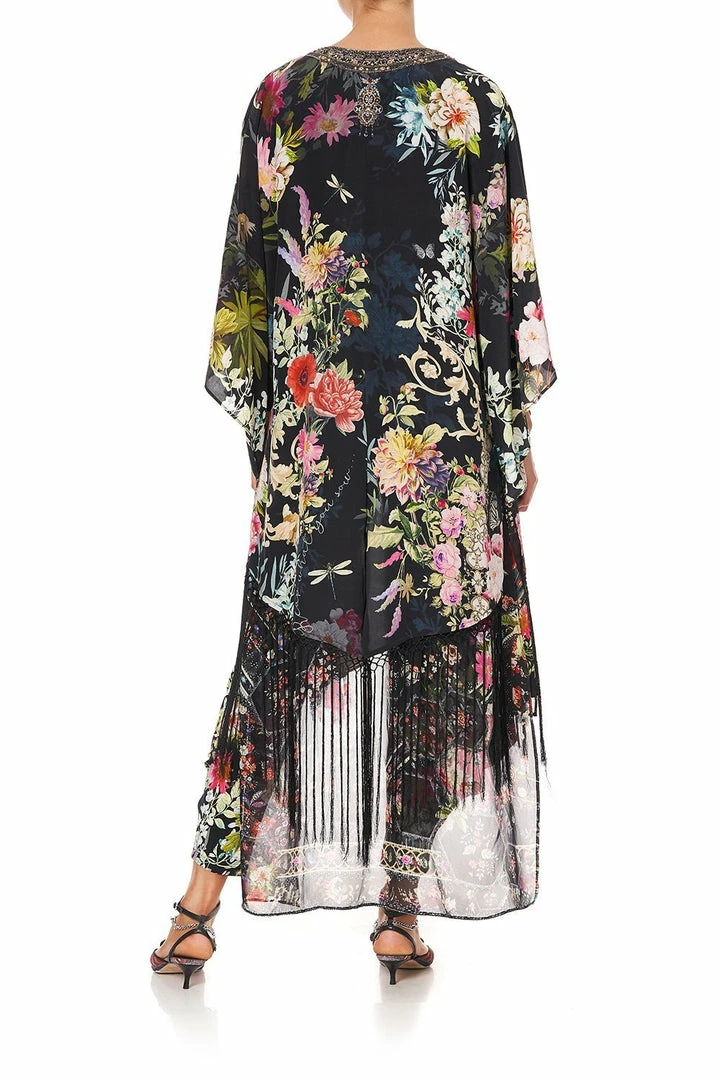 Layering in full bloom – the Hampton Hive Kimono With Long Underlayer is a welcome addition to a simple outfit or teamed with contrasting prints alike. A black kimono adorned with digitally printed flowers inspired by English gardens, made from 100% silk. Kimono sleeves and side splits make it flow, while CAMILLA crystals round off the look.
