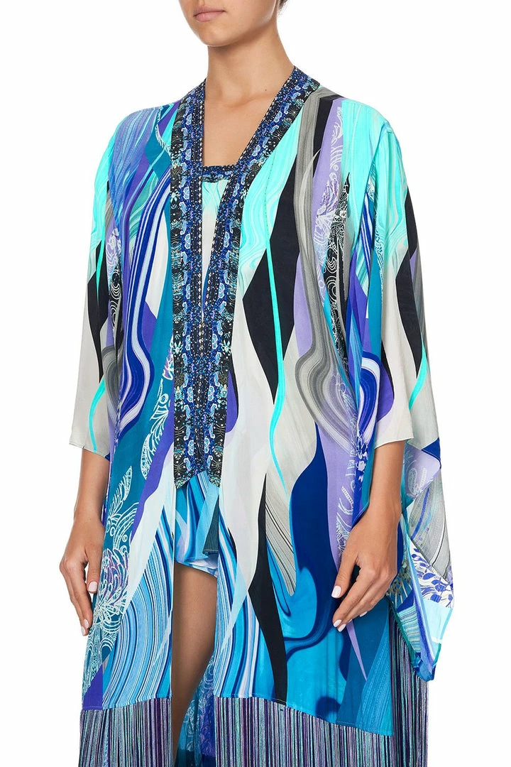 This pure silk kimono sleeve robe features dramatic ombré effect fringing, contrast sheer underlay, wide kimono sleeves, sultry side splits and a heavily crystal embellished lapel for glistening in moonlit revelries.