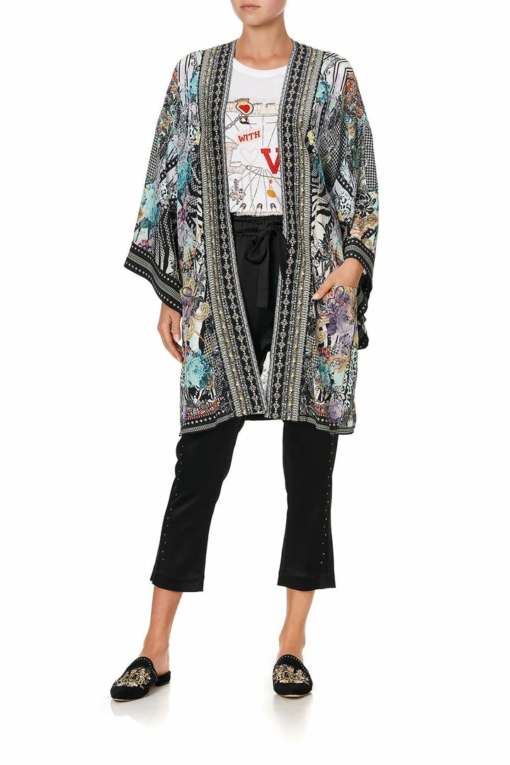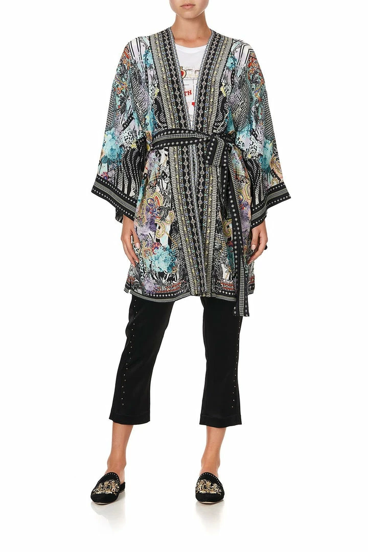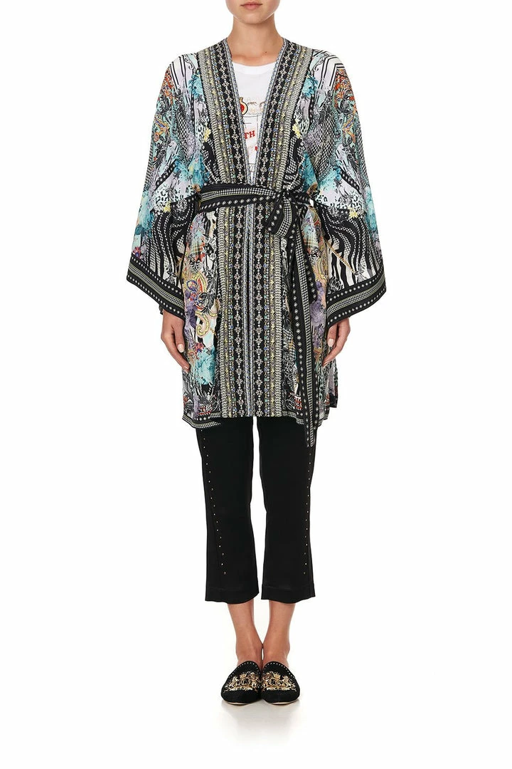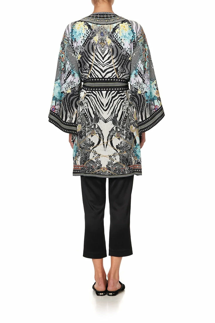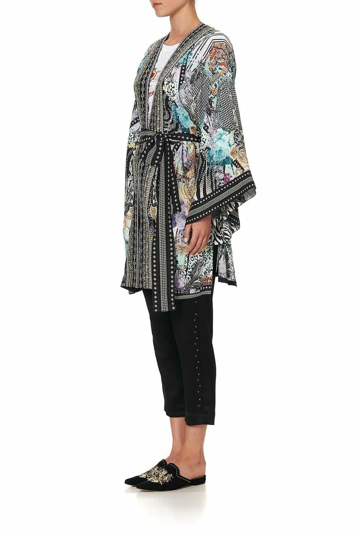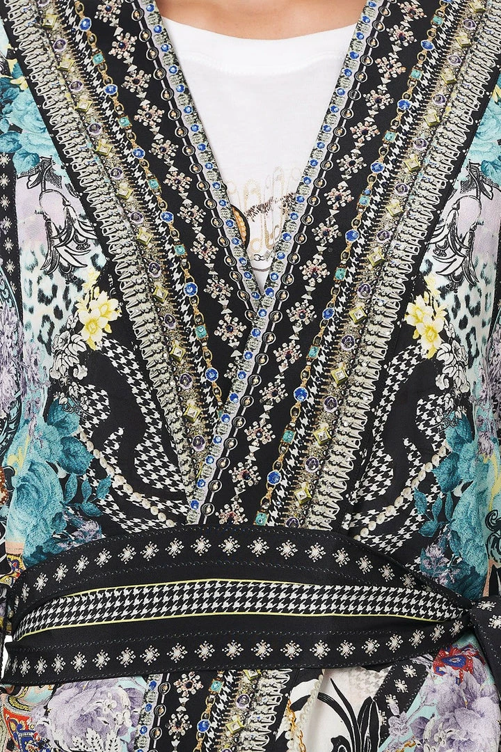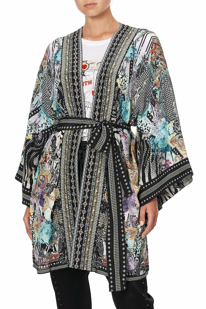 Houndstooth and horticulture clash elegantly with paisleys and zebra print across the pure silk canvas of the Think Kinks Kimono With Tie Belt. Inspired by a British patchwork of punk, this mega mix of prints adds contrast and colour to a signature CAMILLA resort wear silhouette. Framing the opulent medley of prints, a CAMILLA crystal embellished border adds a striking contrast to this open front silk robe. Styled with wide kimono sleeves, patch pockets and a printed belt, this luxe layer is a stunning addition for poolside lounging and also looks fabulous over the matching Sid The Kid Slip Dress With Front Splits.