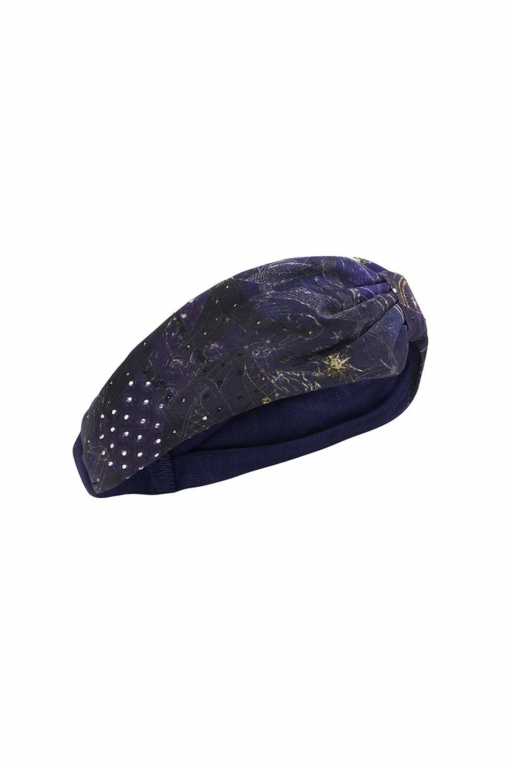 An opulent piece of gypsy headwear, the It’s a Sign Knit and Woven Twist Headband is rich with a velvety navy scene of the Scorpio constellation. This lush dark blue headband is crafted in a soft silk and features an elasticated knitted band for easy gliding, a centre statement gathering knot and is polished with a glittering array of hand-applied crystal embellishments reminiscent of a night sky. Style back with matching print silhouettes for a head to toe look.