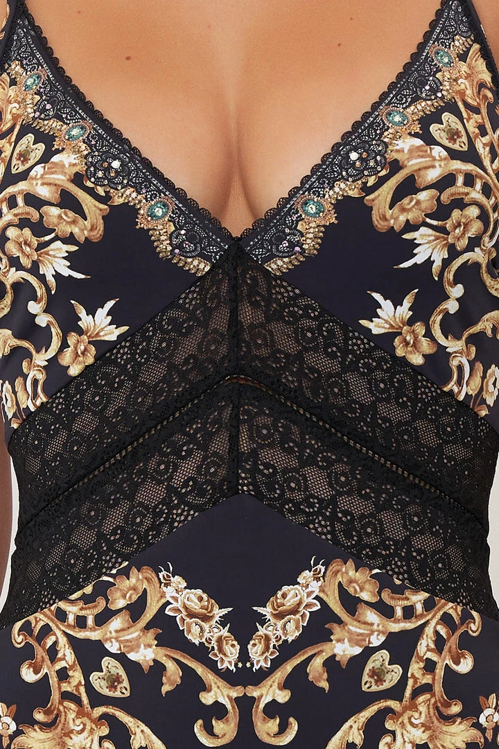 Crafted to tantalise from all angles, the Dance With Duende Lace Insert Bodysuit steals our gaze with gold baroque detailing and classic black lace inserts upon the waist. Adorning hand-embellished CAMILLA crystals, this luxury bodysuit features a deep v neckline, a fitted silhouette, a high-rise cut and adjustable straps for your most perfect fit.