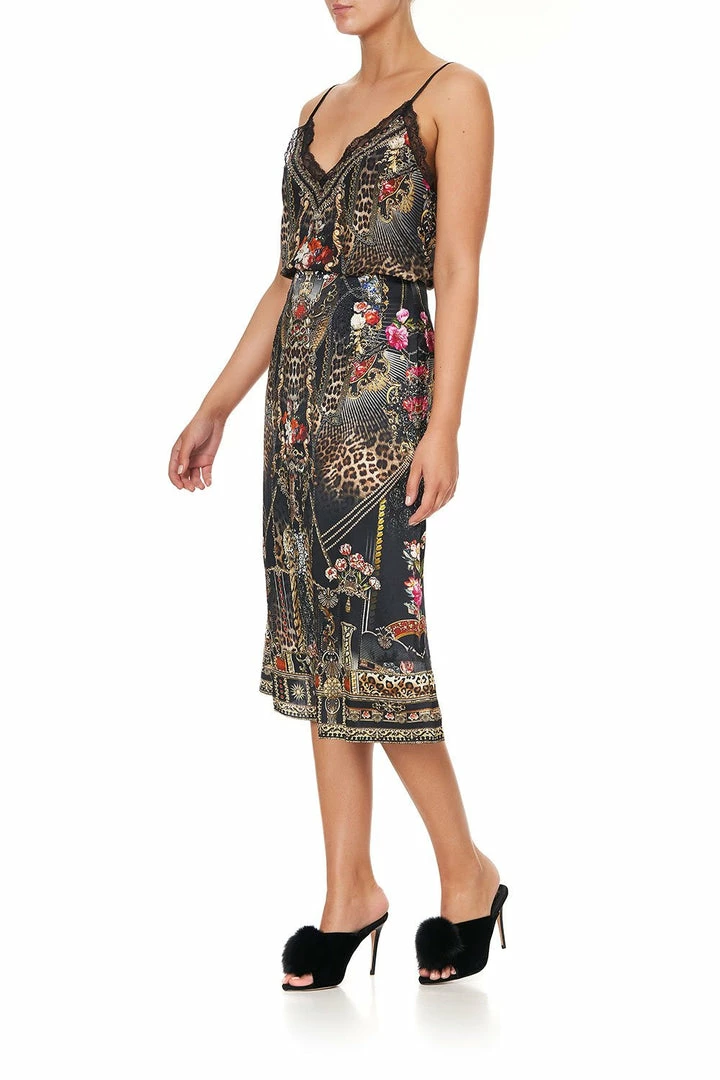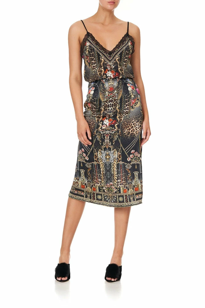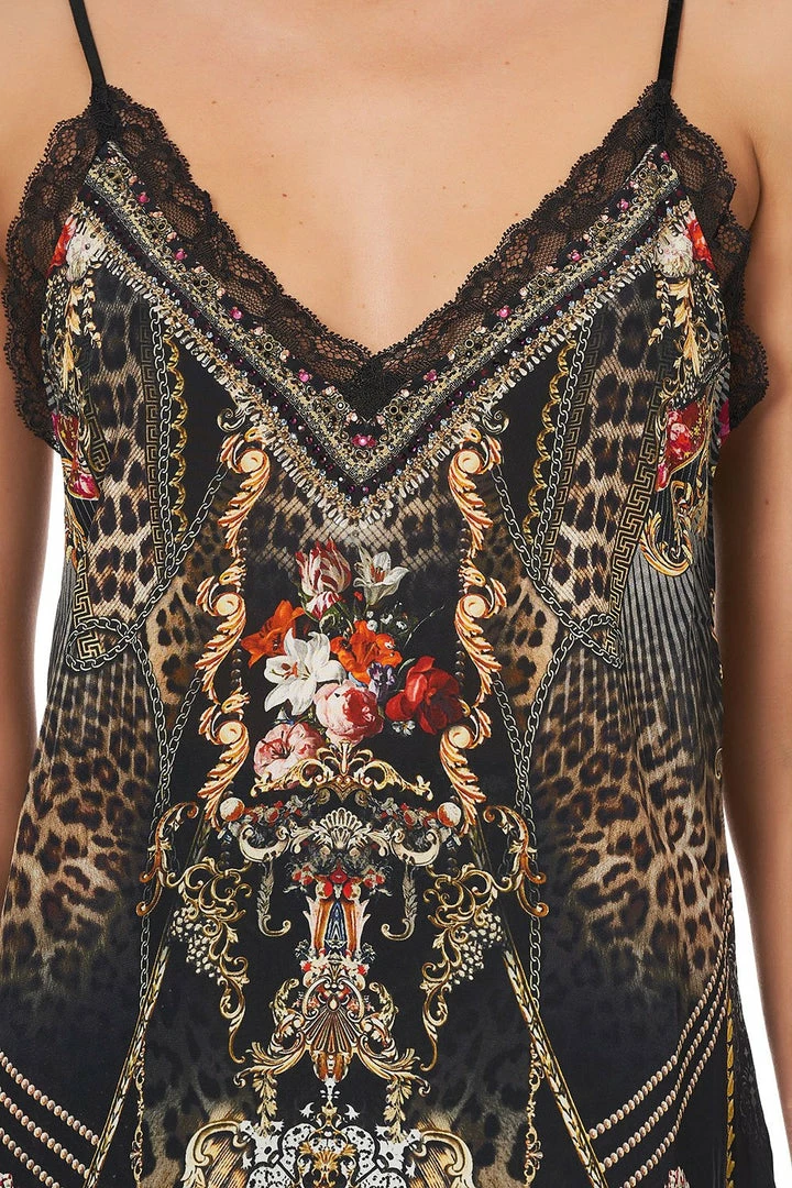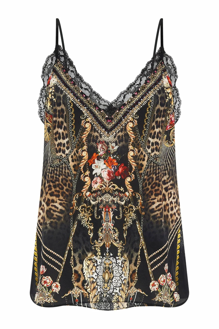 Effortlessly glamourous, the Gothic Goddess Lace Trim Cami is inspired by romantic gothic architecture and the colours created by stained glass windows in ancient cathedrals. This cami is fashioned from luxurious silk in which features soft pink florals and dripping golden chains, finished with flickering CAMILLA crystals. This silk camisole features an elegant V-neck trimmed in eyelash lace with adjustable straps to ensure the perfect fit. A versatile piece suitable for casual days or formal evenings, it is an elegant addition to any outfit. Worn with the Gothic Goddess Slip Midi Skirt, this ensemble becomes a beautiful dress.