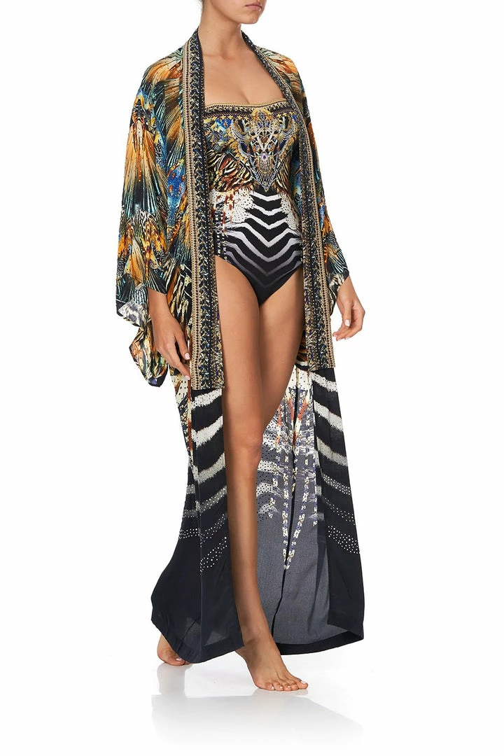 Pair back with the Lost Paradise Ring Trim Long Sarong to elevate your tropical beachside look or with the Lost Paradise Kimono Coat for a luminous seaside to bar ensemble.
