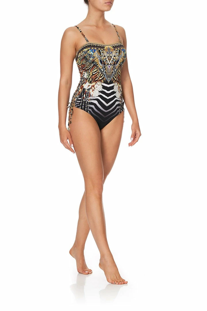 Luxe strapless one piece, the Lost Paradise Lace Up Bandeau One Piece draws inspiration from the Great Barrier Reef and all of its exotic treasures. This feminine Italian lycra creation features sleek removable or adjustable straps, regular coverage bottom, removable soft cups to fit a true B-C cup bust, lace up ties with CAMILLA charms and glistening crystal embellishments for an alluring finish.