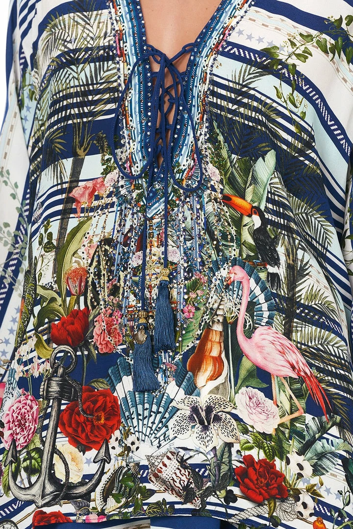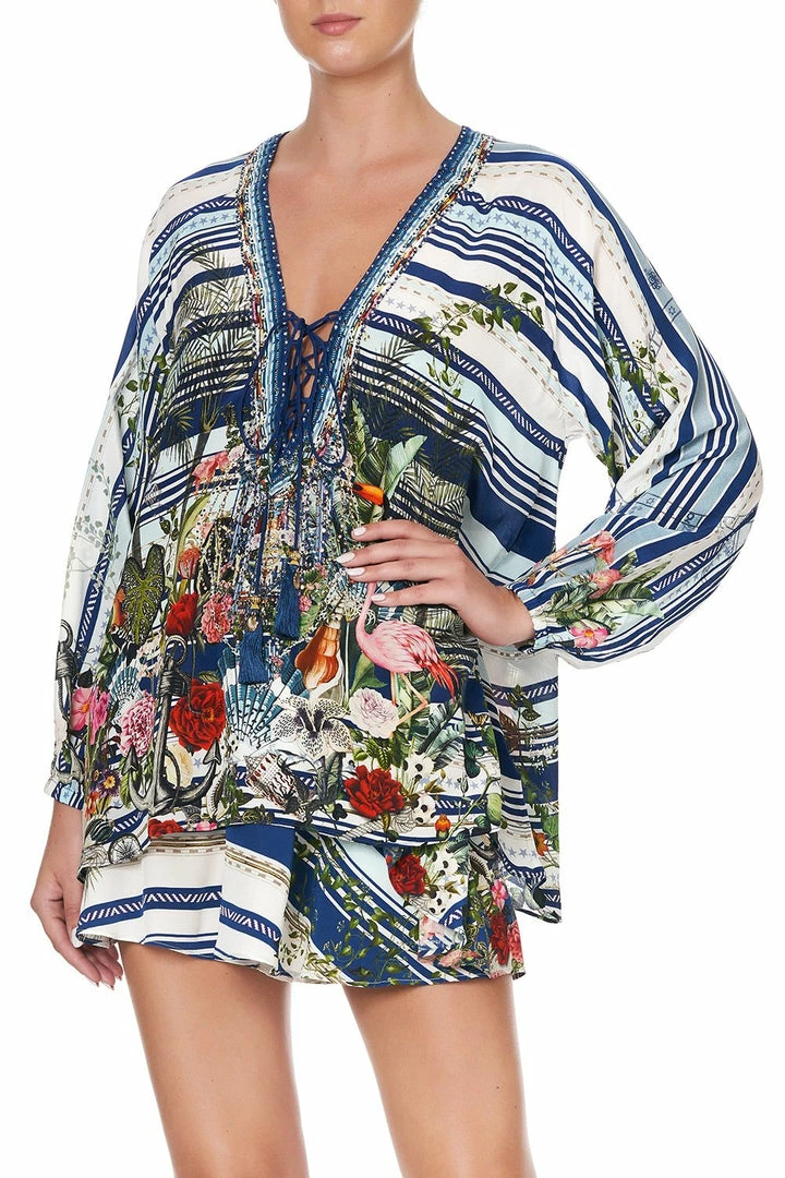 As a forever celebrated CAMILLA statement top, the Solis Heart Lace Up Blouse is divinely elegant. Crafted in a heavenly silk canvas inspired by trippy space gardens and constellations discovered in hippy haunts, it features an alluring lace-up front, beaded tassels, elasticised cuffs and crystal embellishment around the neckline. Pair with matching shirred pants for a divine boho summer look.
