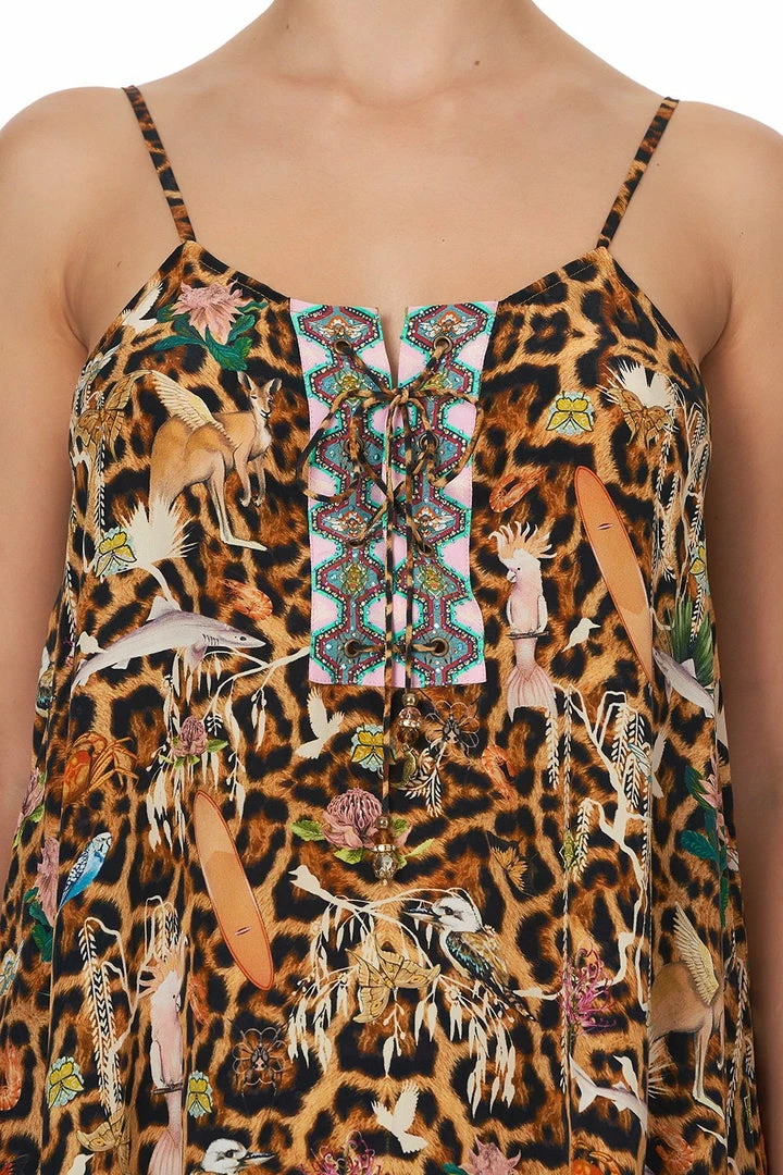 Musing 70s silhouettes, the Fauna Electro Lace Up Front Cami hosts an eclectic jubilee of Australian hybrid native animals against a retro backdrop. Crafted with printed CAMILLA silk, its flared fit accentuates form, while its shoestring straps and lace front lends to a retro vibe. Pair with your favourite flares to embody a chic retro festival look.