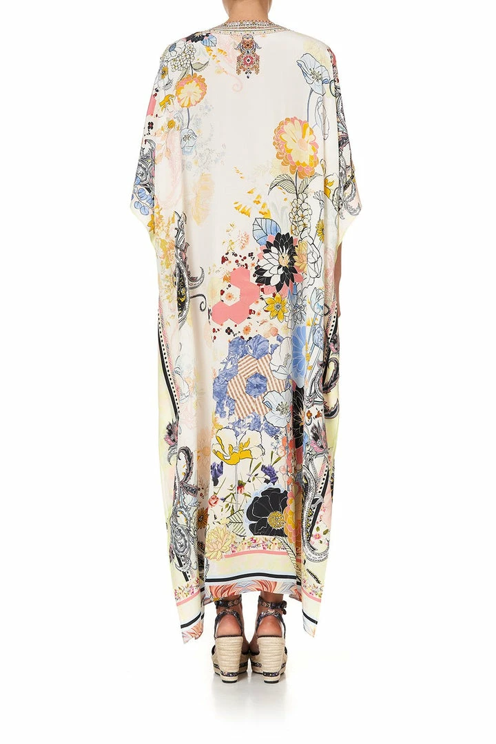 Conjuring up memories of English country gardens and manor houses filled with vintage haberdashery, the Britain Bouquet Lace Up Kaftan adds a graphic twist to this vision of floral splendour. A patchwork of print, inspired by an eccentric coupling of intoxicating blooms, adorns the pure silk canvas of this kaftan dress. Bold in its palette of fresh spring hues, this silk kaftan is styled in a free-flowing silhouette with a lace up front, V neckline and dazzling CAMILLA crystal embellishment. A relaxed lace up dress, designed for basking at a summer resort, this maxi length kaftan is best styled with wedges for a polished yet happy-go-lucky look that matches the joyful horticultural aesthetic.