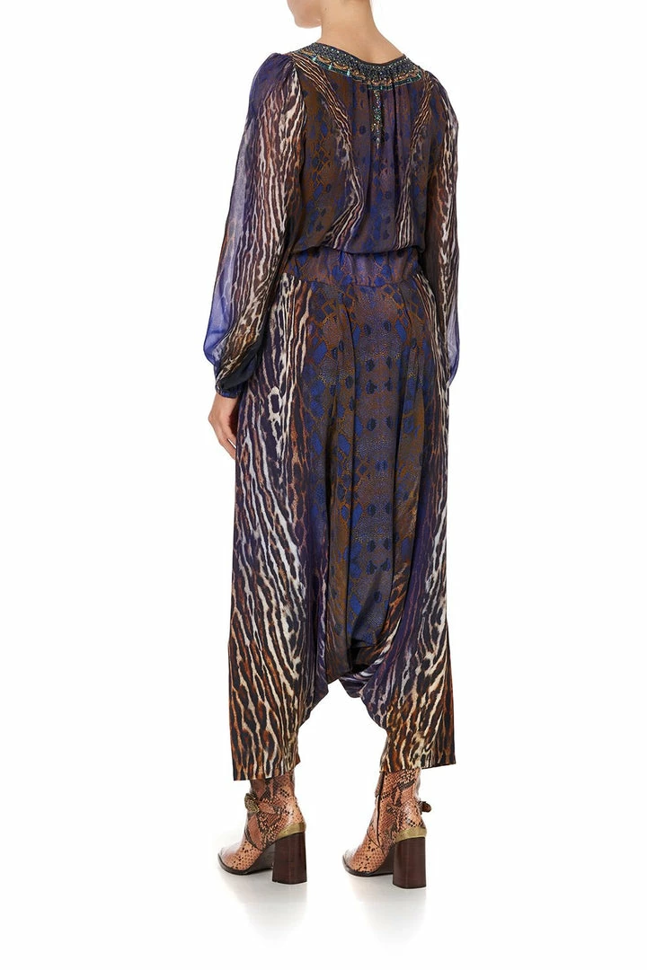 An elevated blouse designed with a rich black based print inspired by a zoologist, the Komodo Queen Lace Up Side Blouse pays tribute to her lifelong work in protecting the life of the Komodo dragons. Designed with a deep V neckline and button front detailing allows the option of an open blouse feature. This silk blouse flatters a wide range of sizes, featuring a blouson sleeve with elasticated cuff and adorned with glistening hand-placed CAMILLA crystal embellishment as detail.