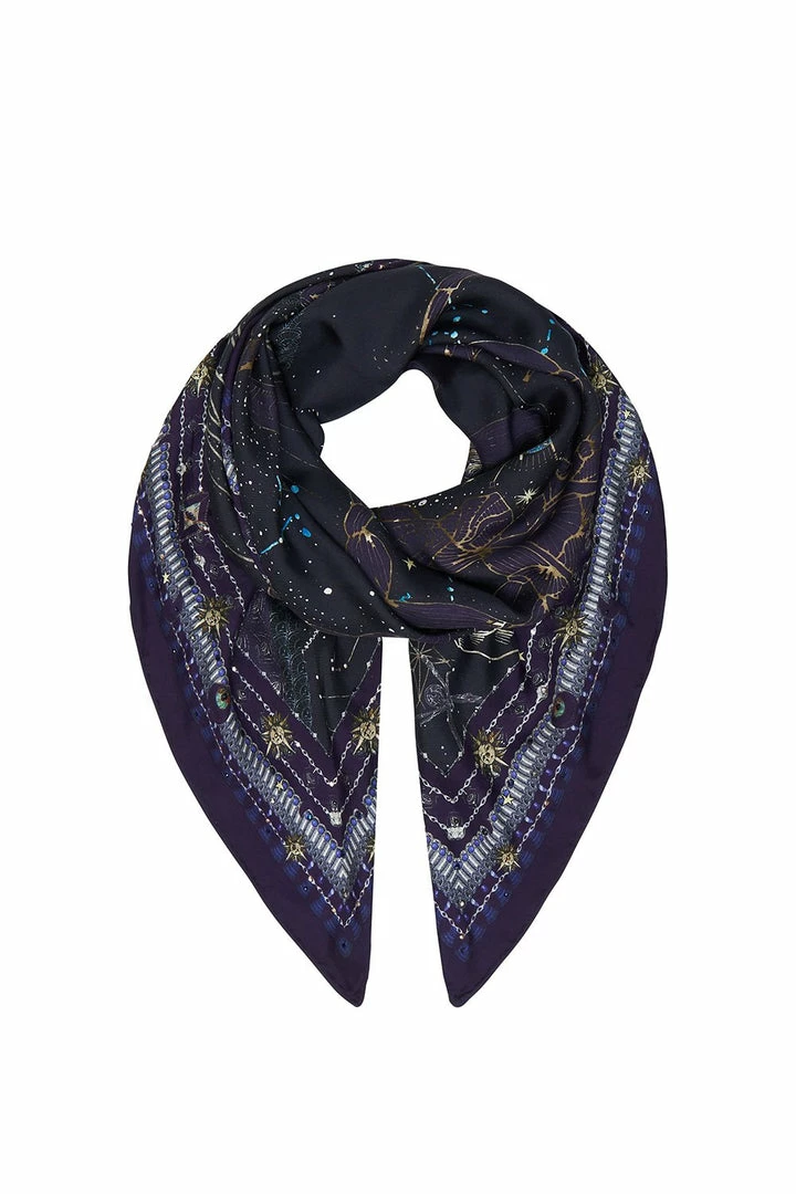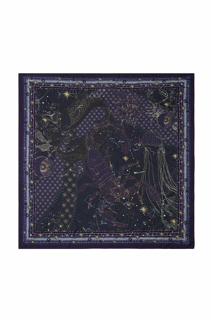 A silk scarf with endless styling possibilities, the It’s a Sign Large Square Scarf is enriched with a scene of the Scorpio constellation and its surrounding stars. This navy 1 metre scarf features an all over print designed by in-house CAMILLA artists, a striking contrast border, as well as hand-placed crystal embellishments as detail. Simply wrap and style as head scarf or visit the CAMILLA style guide to view the many ways to style.
