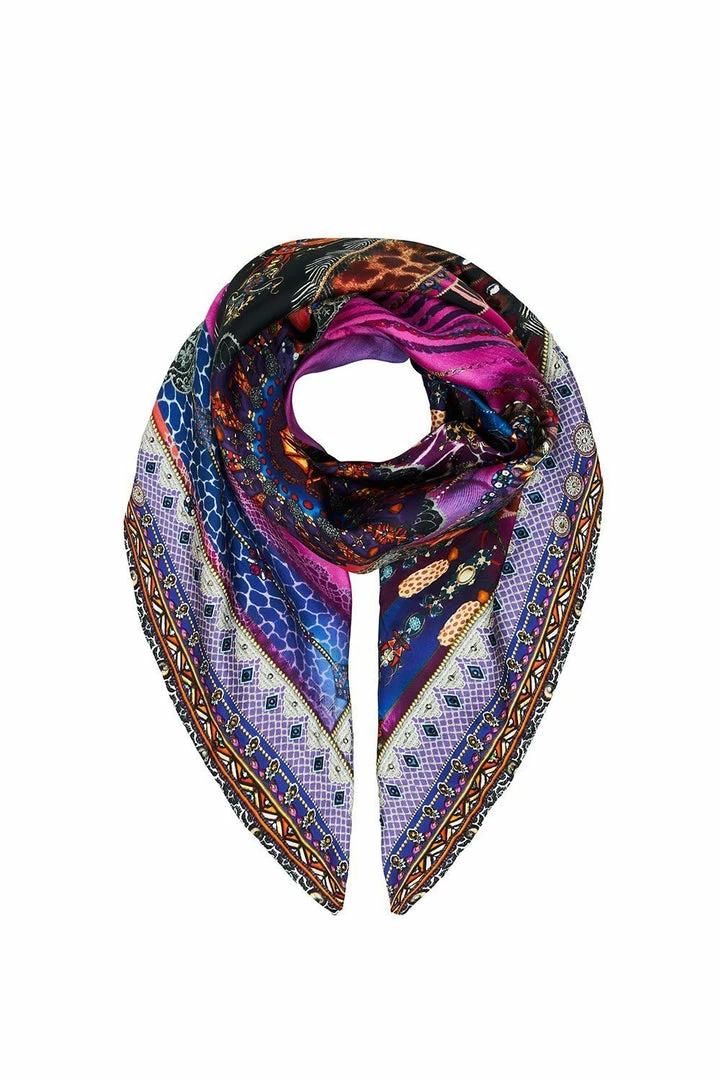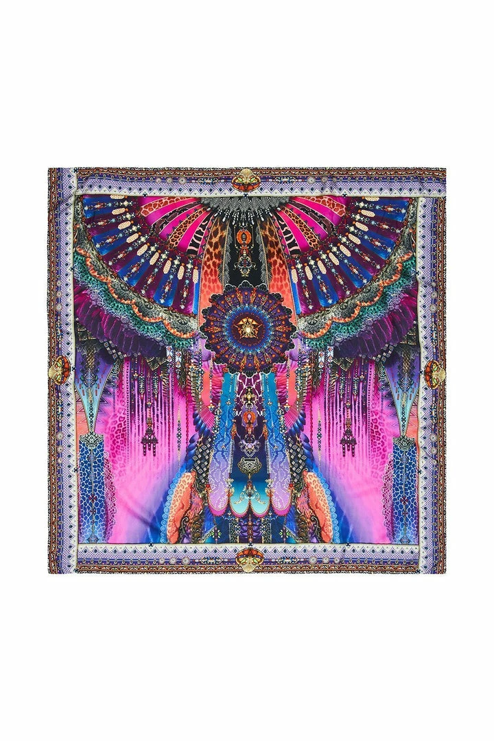 Ready to adorn any outfit the Midnight Madness Large Square Scarf adds a pop of vibrancy to your ensemble. A multi-wear accessory displaying a vibrant interpretation of the gothic inspiration from this collection, the silk scarf displays clearly the motifs of the season via stained glass detailing against a pattern reminiscent of a gothic vaulted ceiling. This divine patchwork of royal hues is punctuated with CAMILLA crystals and finished with a border of architectural patterns. Add as the finishing touch to your look or hang as a piece of art on your wall.