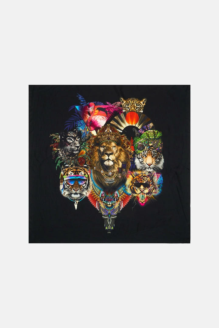 A striking portrait of big cat majesty, the Solid Black Large Square Scarf is a mosaic of futuristic felines adorning opulent jewels, moments of violet botanicals and vibrant details. Hand-embellished with signature CAMILLA crystal, this luxury silk scarf features a large expanse, a complete black backdrop and multi-wear design. With an array of ways to wear, transform it into a summer top or lace it upon your handbag handle.